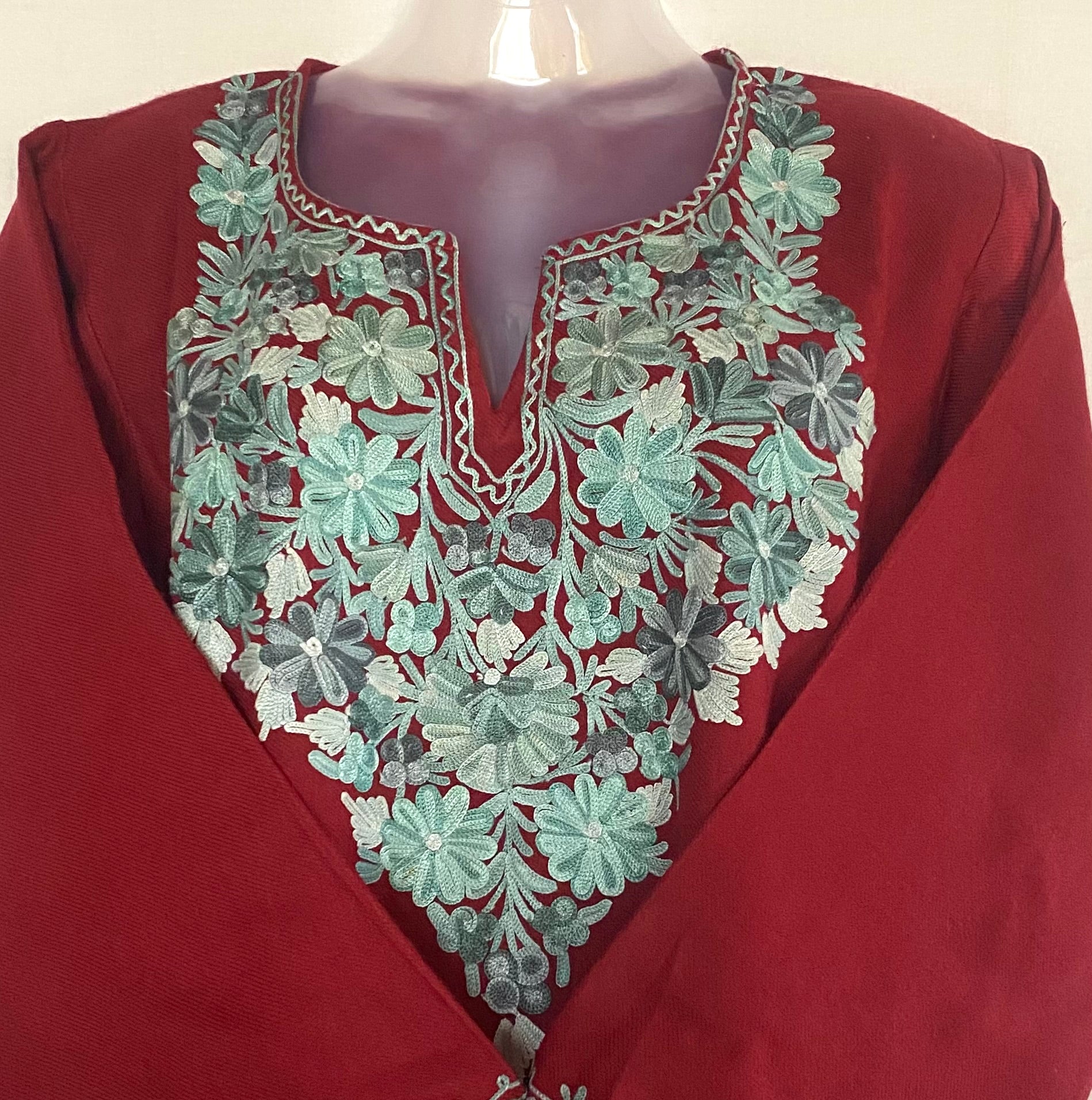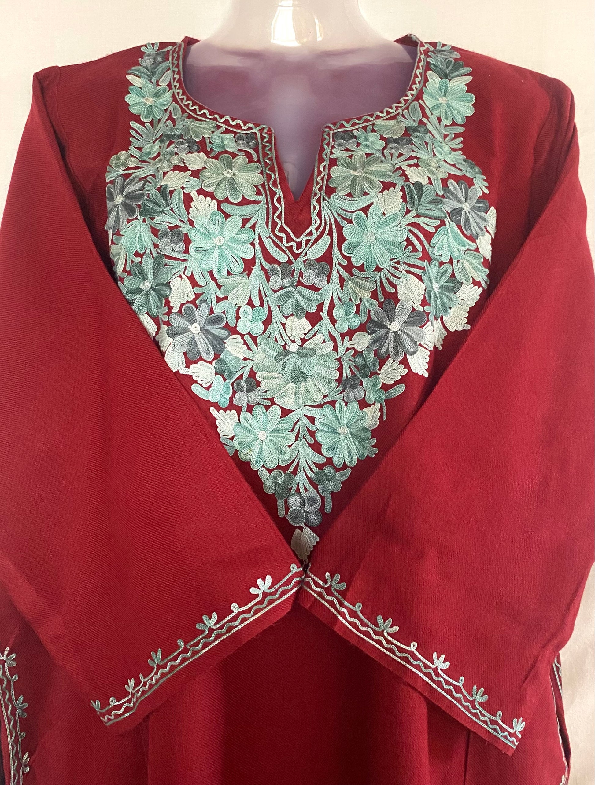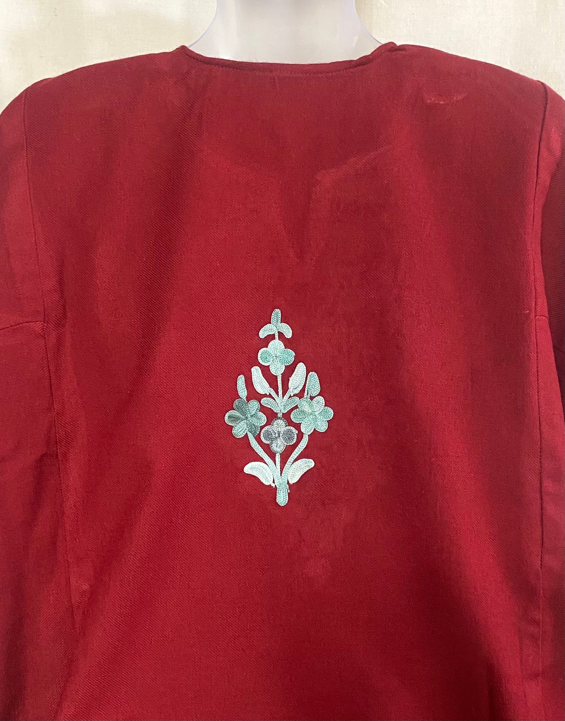 This cozy maroon warm pheran blends elegance with comfort, perfect for chilly days and evening outings.