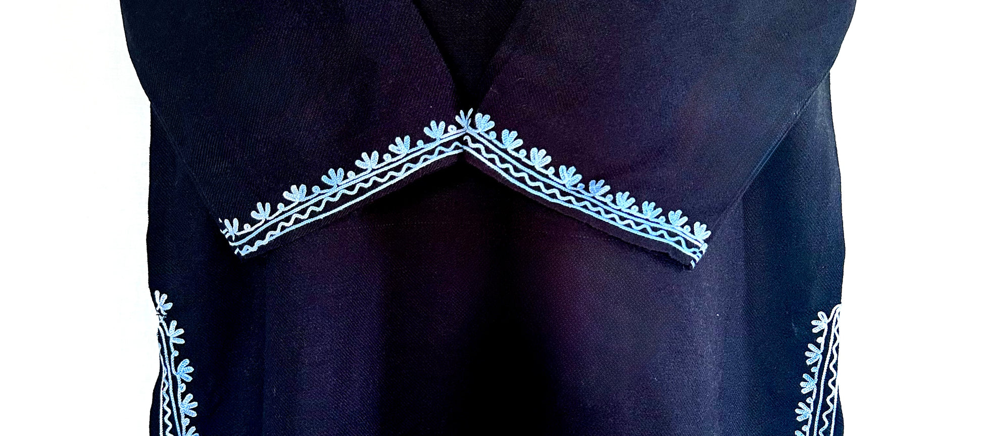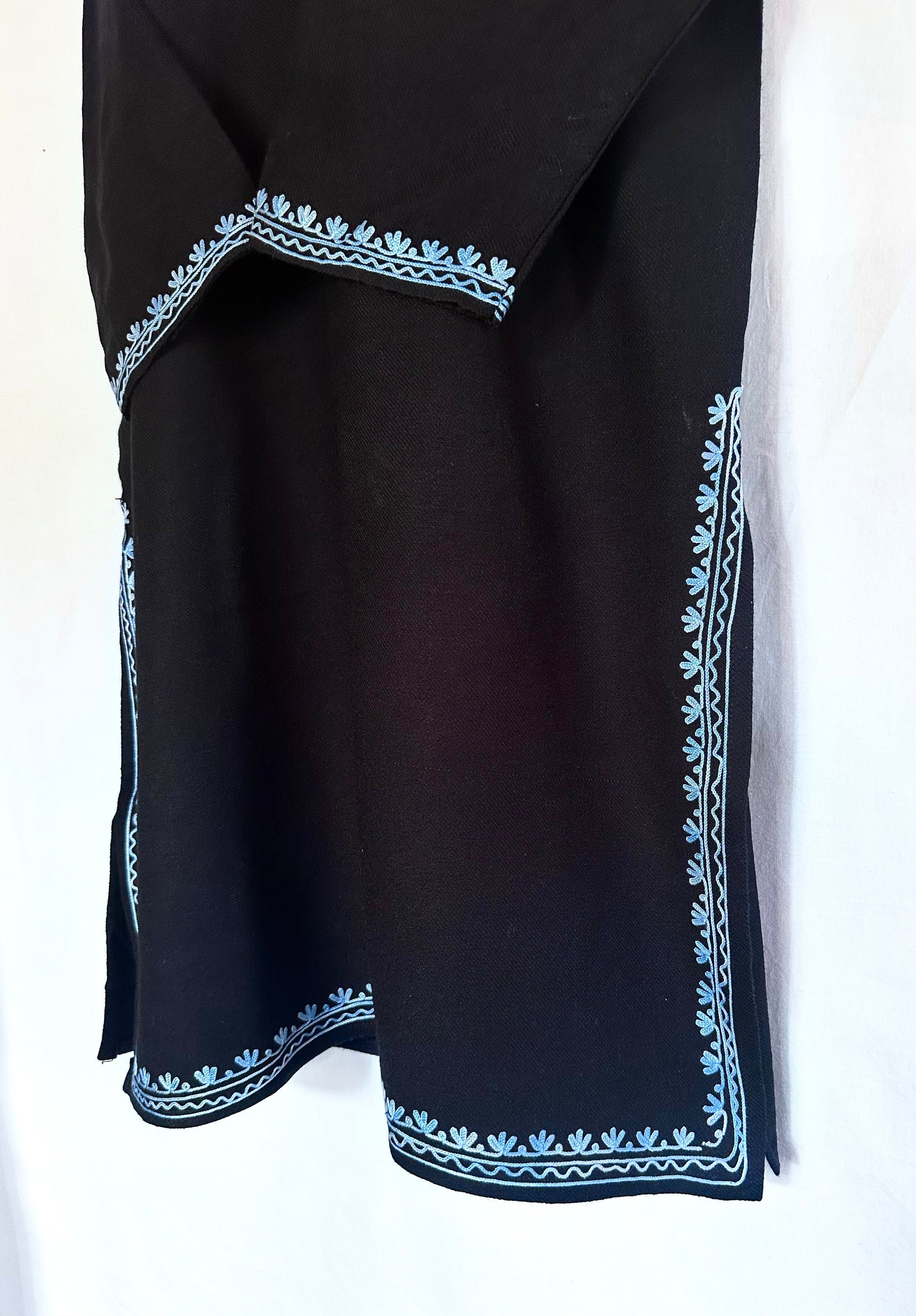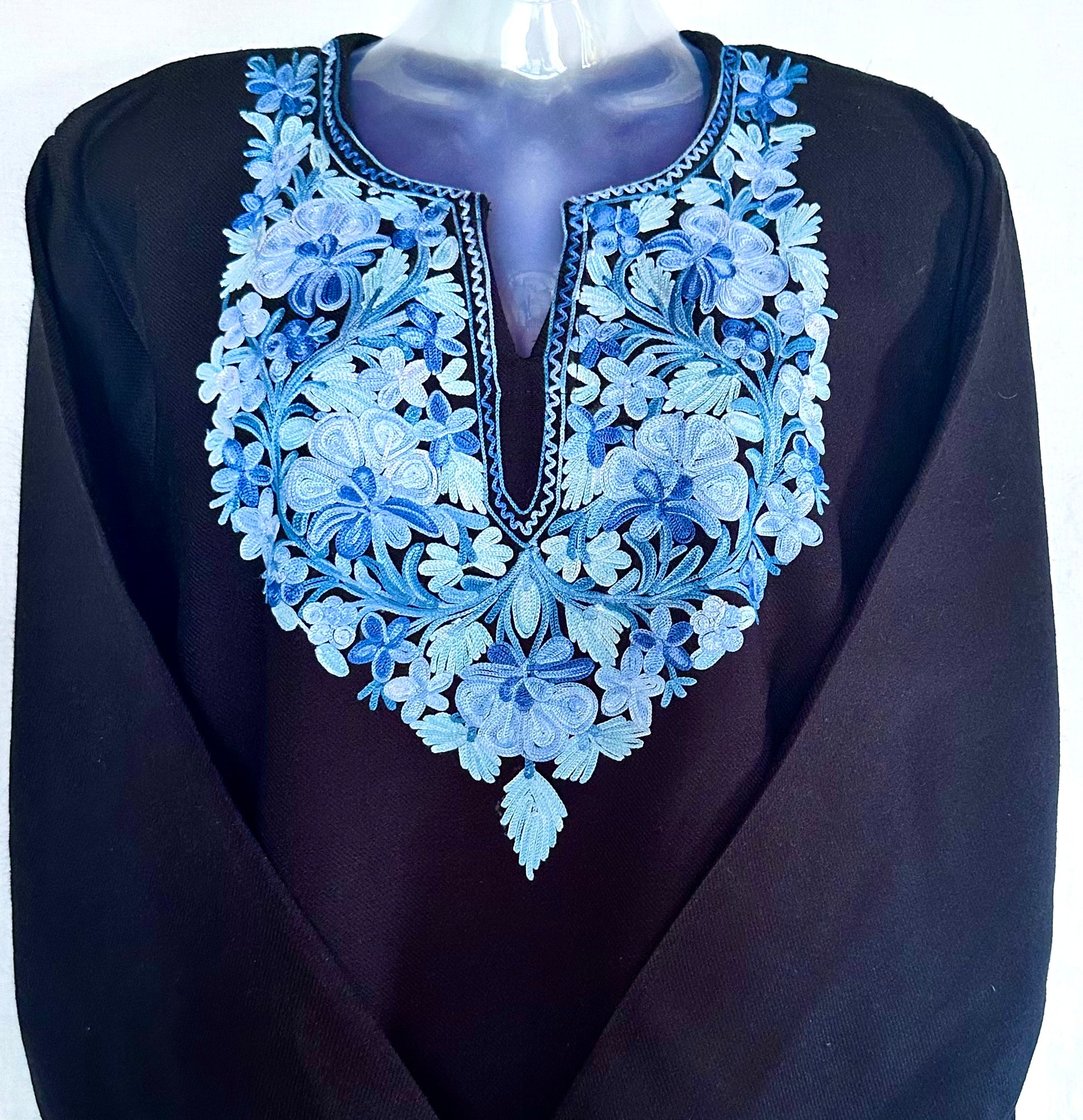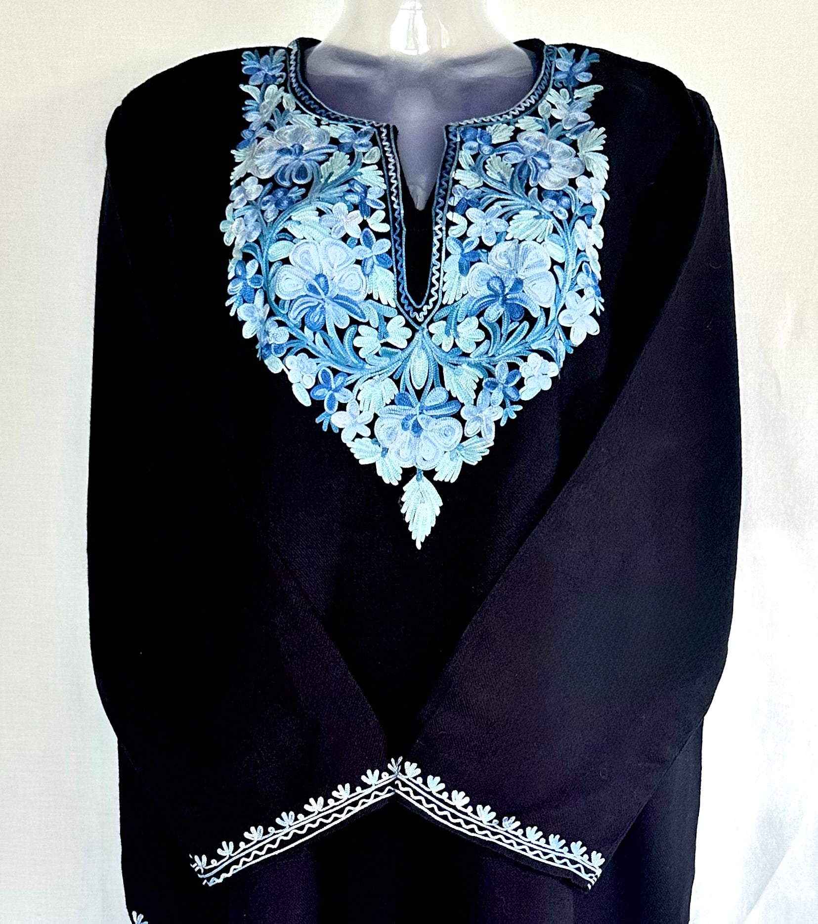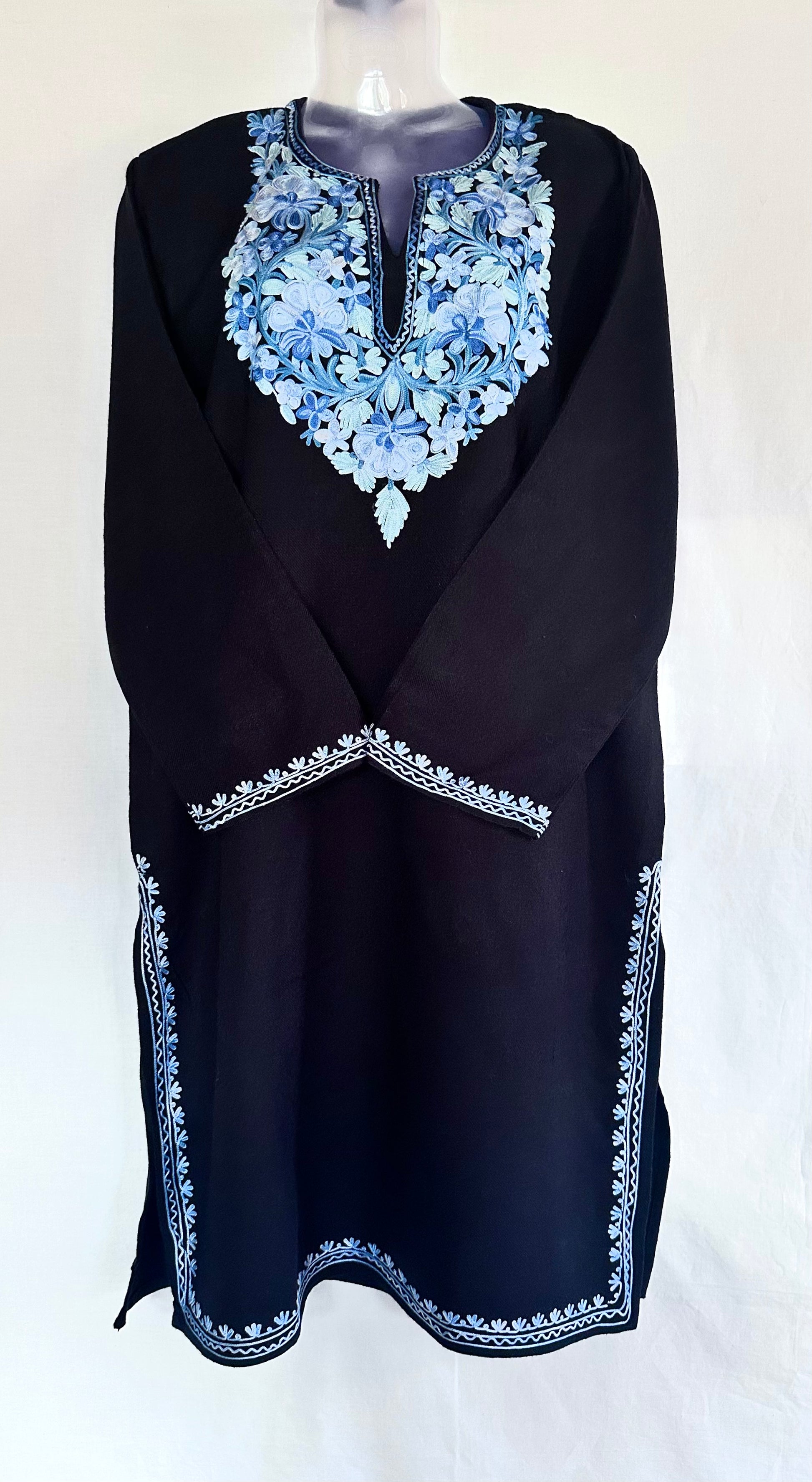 This deep black kurta is elevated with refined blue aari work, adding just the right touch of color and character.