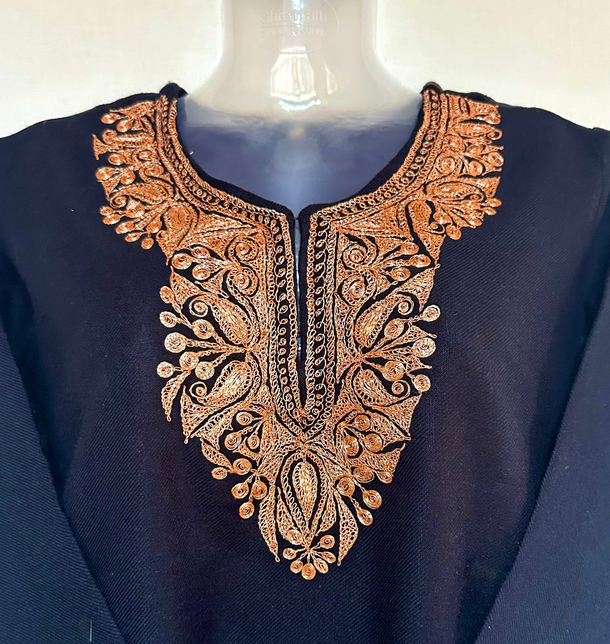 A statement winter kurta in deep black wool, finished with graceful golden tilla work for a refined, festive charm.