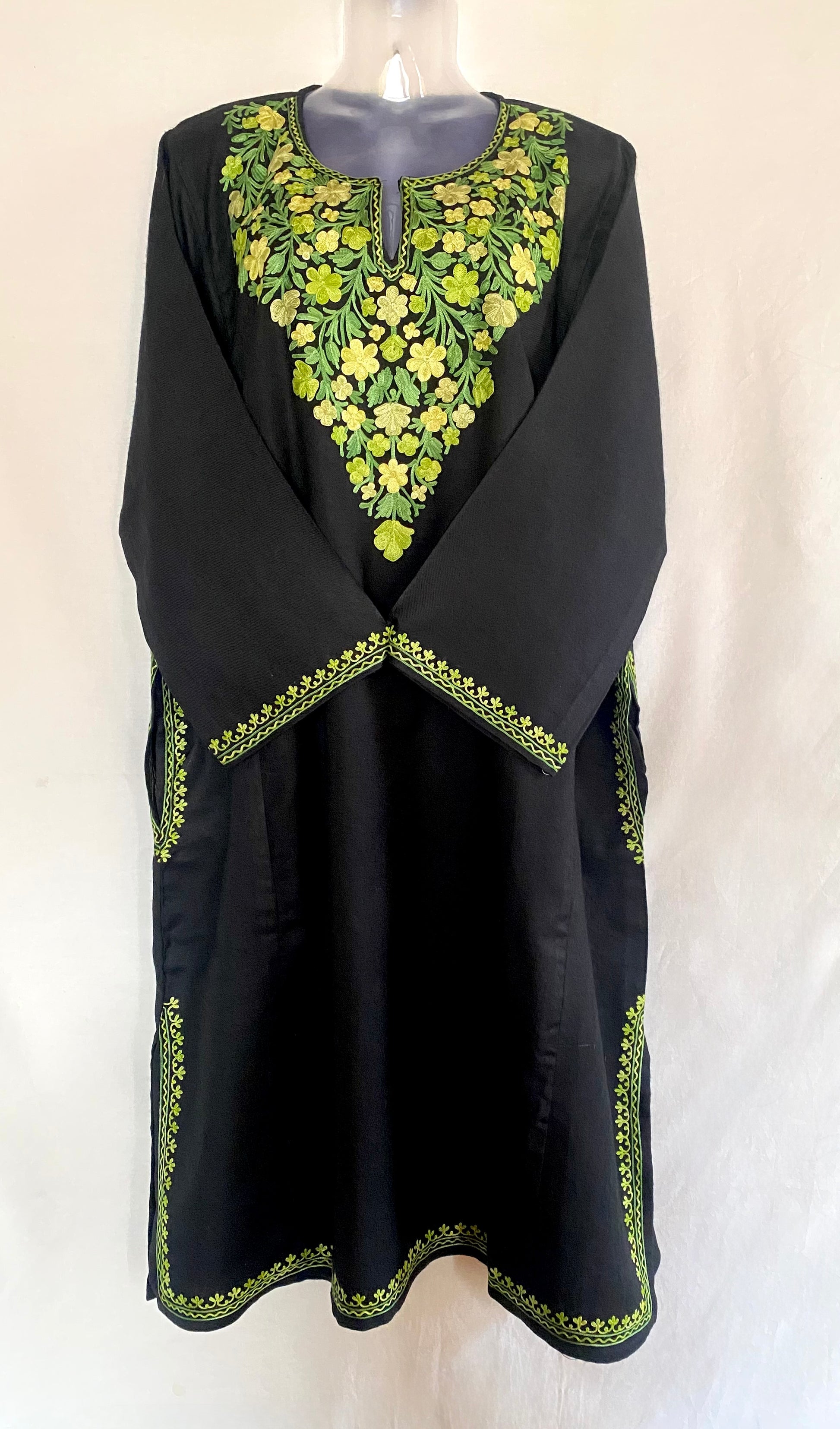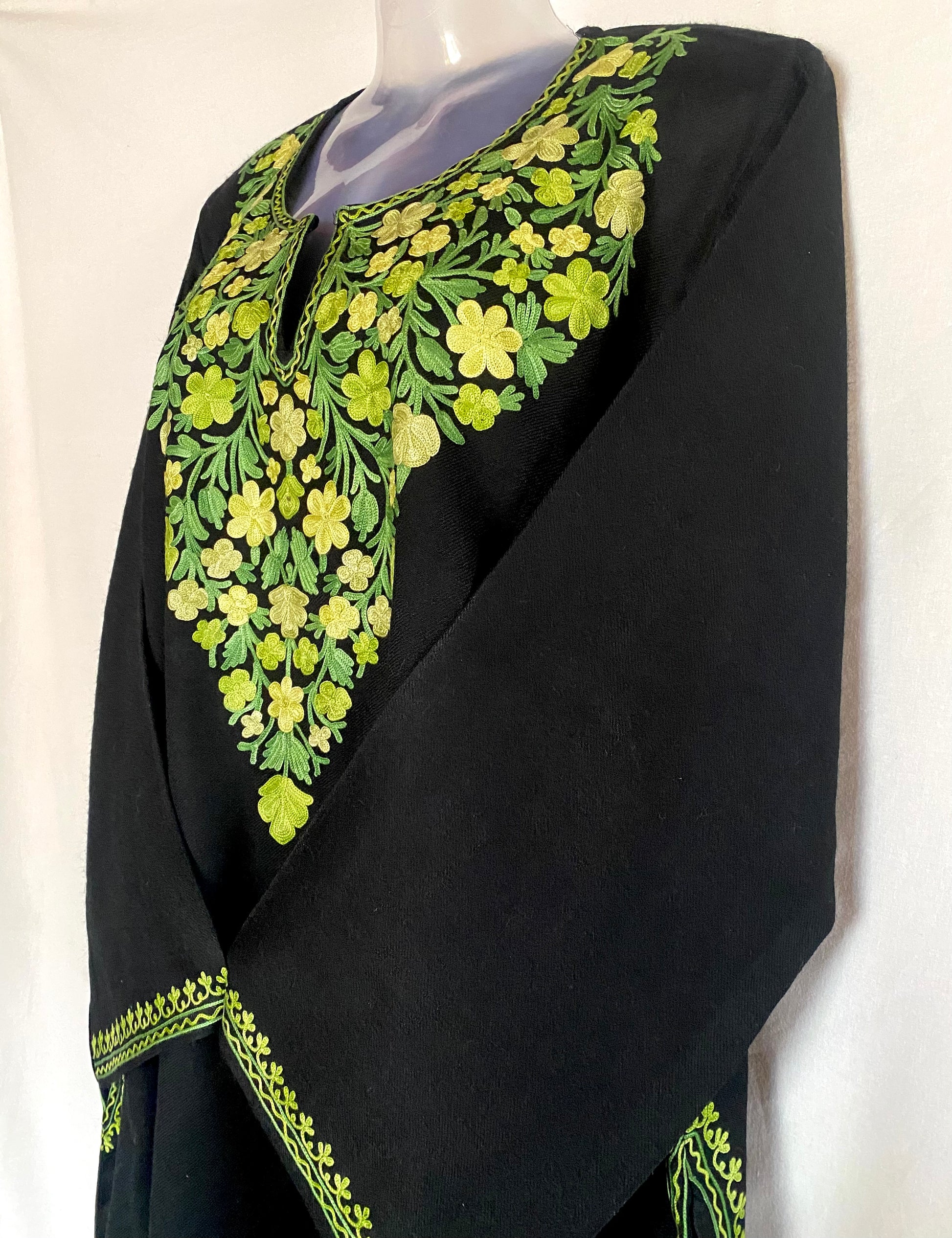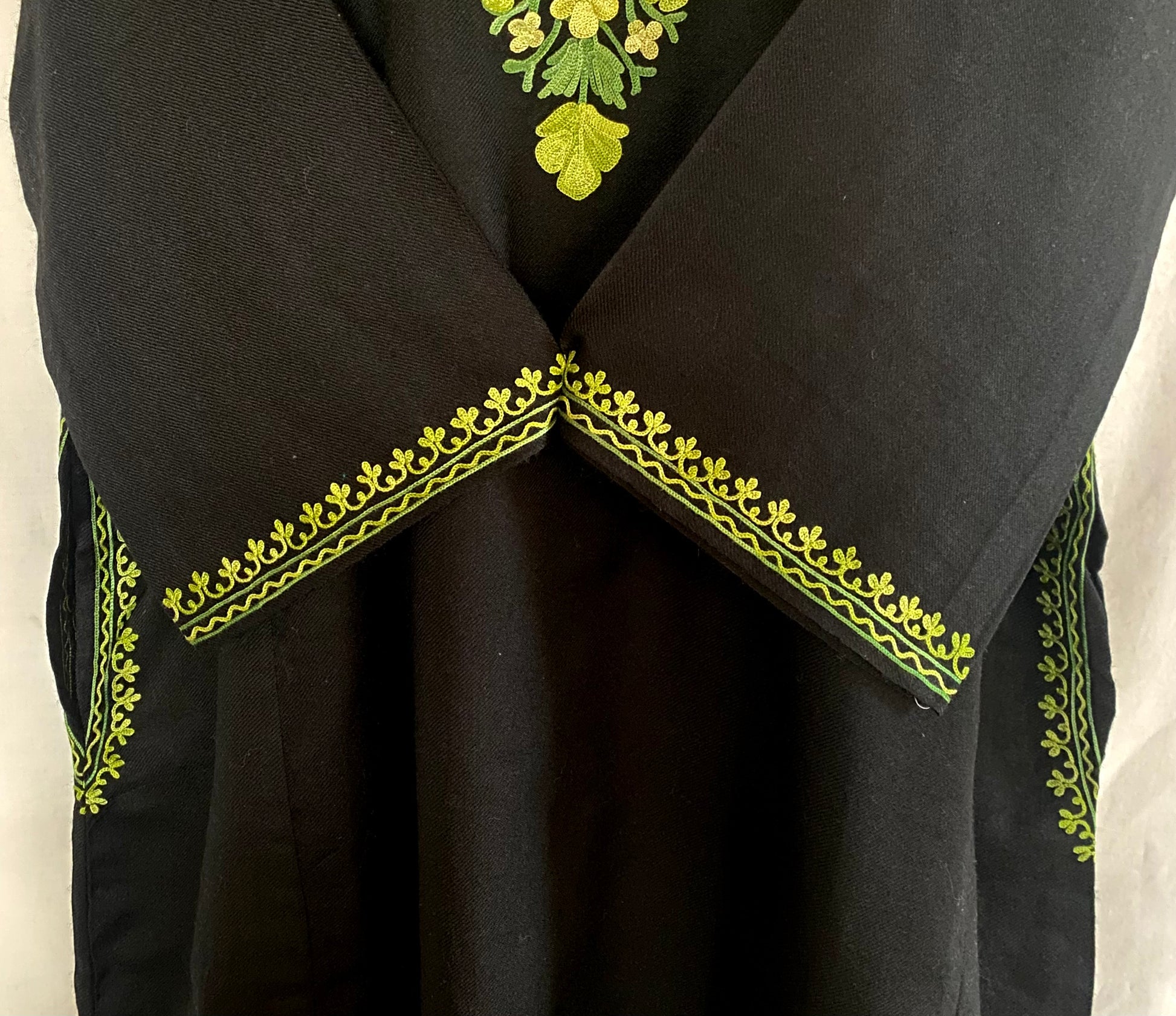 The vivid green embroidery adds a graceful pop of color to the classic black raffal pheran, making it truly stand out.