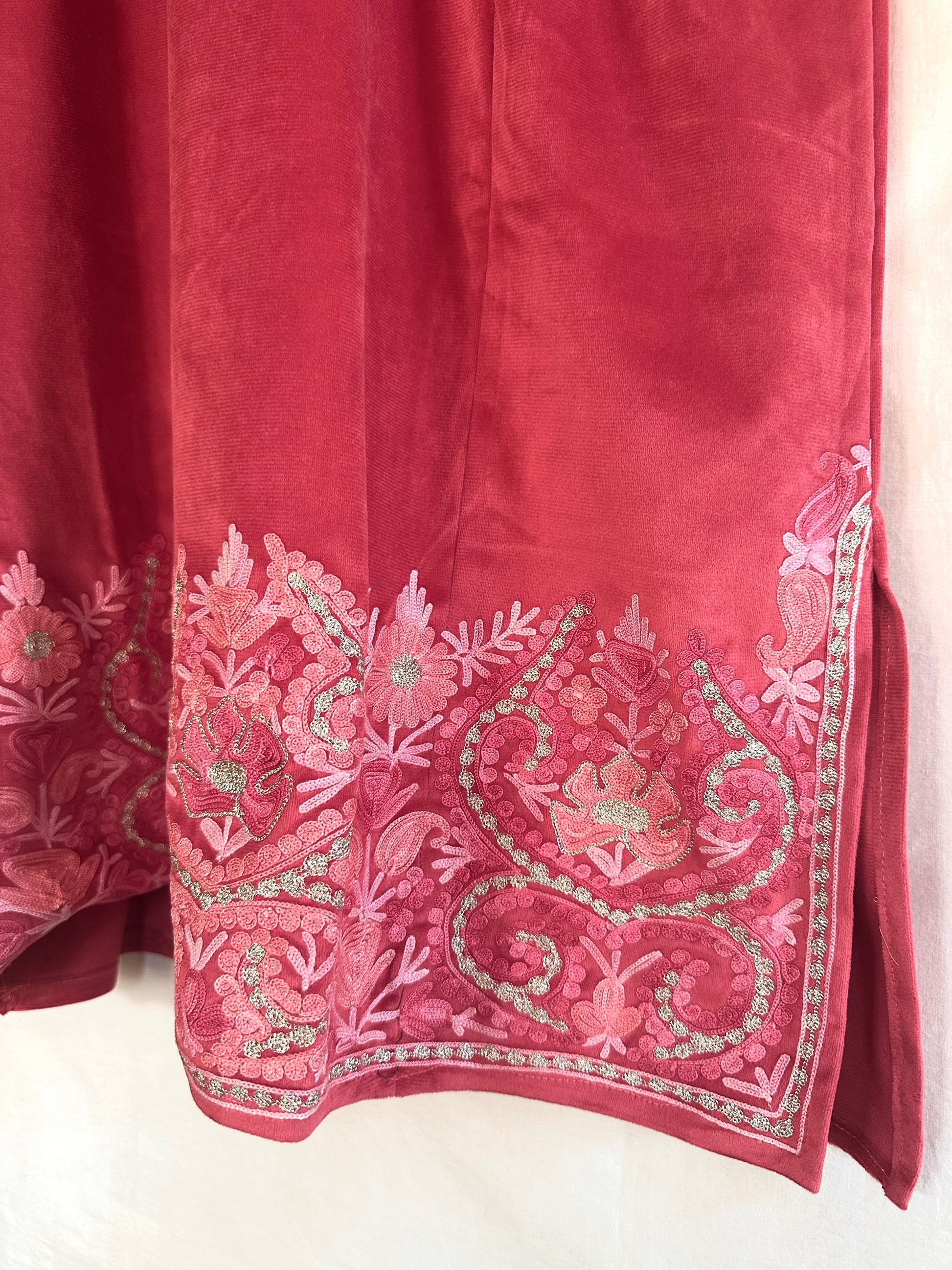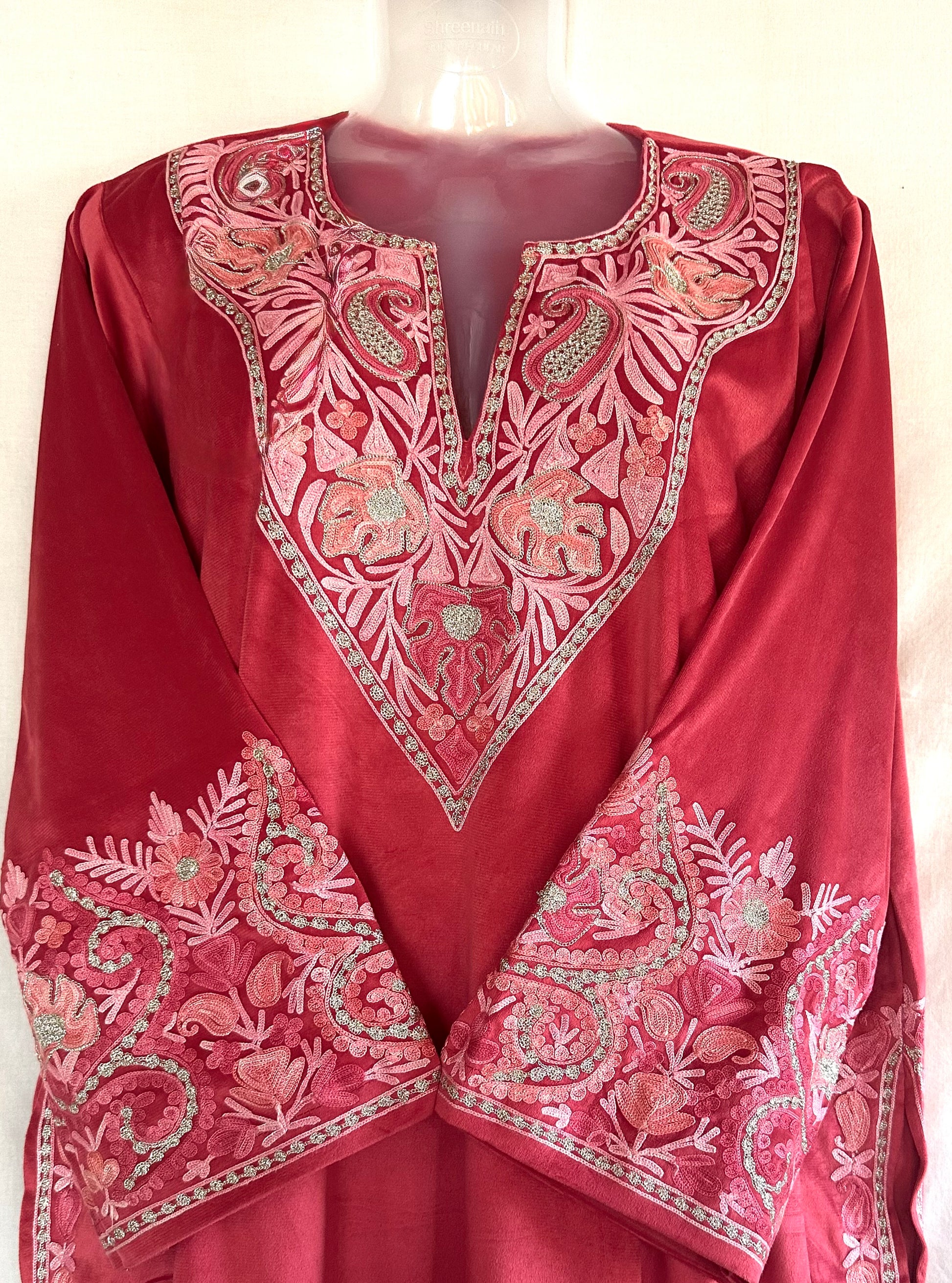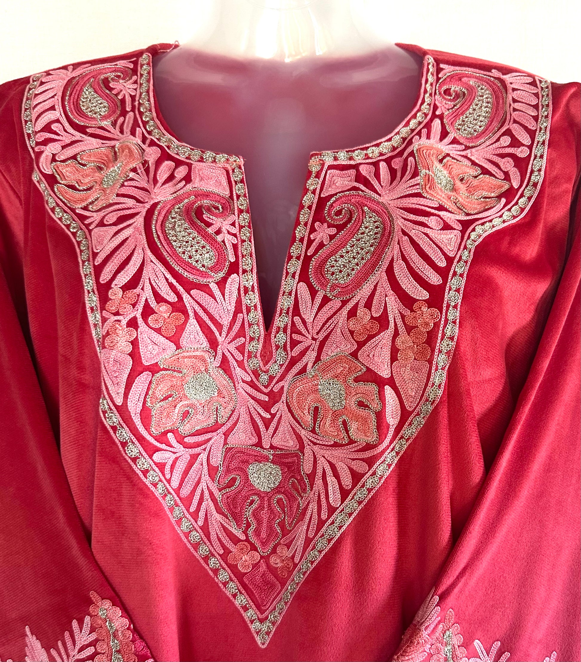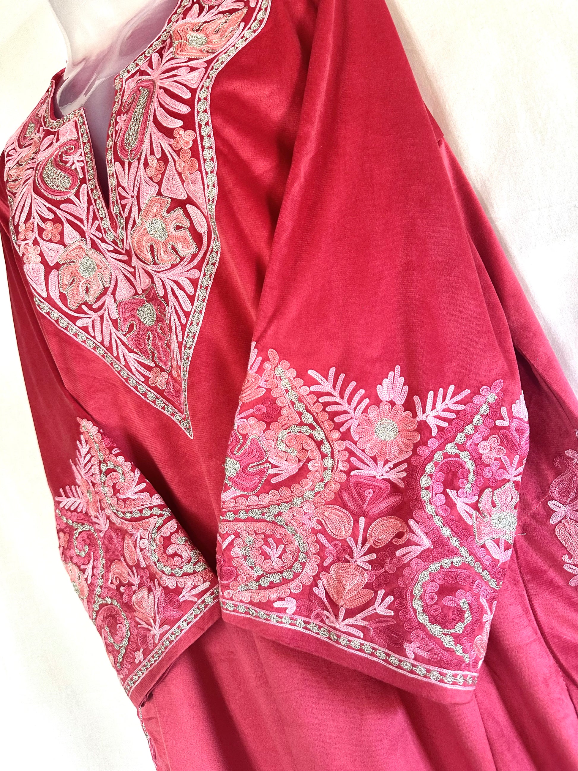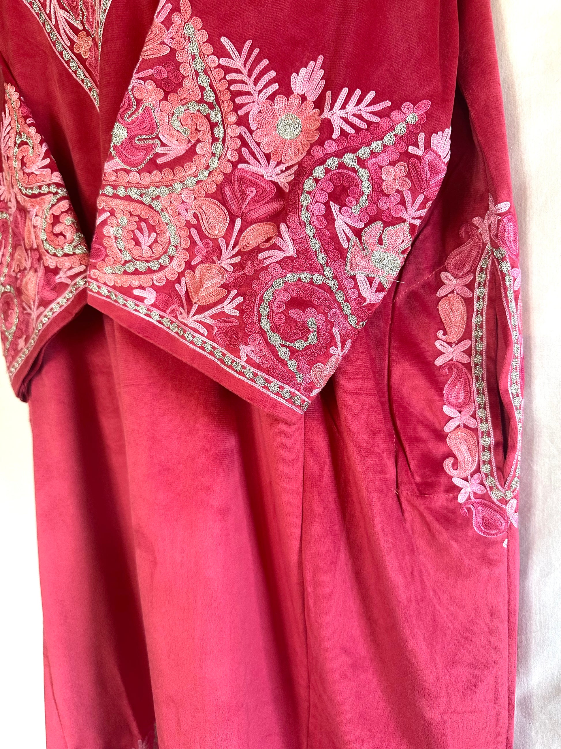Draped in plush velvet, this pheran in delicate pink radiates poise, softness, and sophistication.