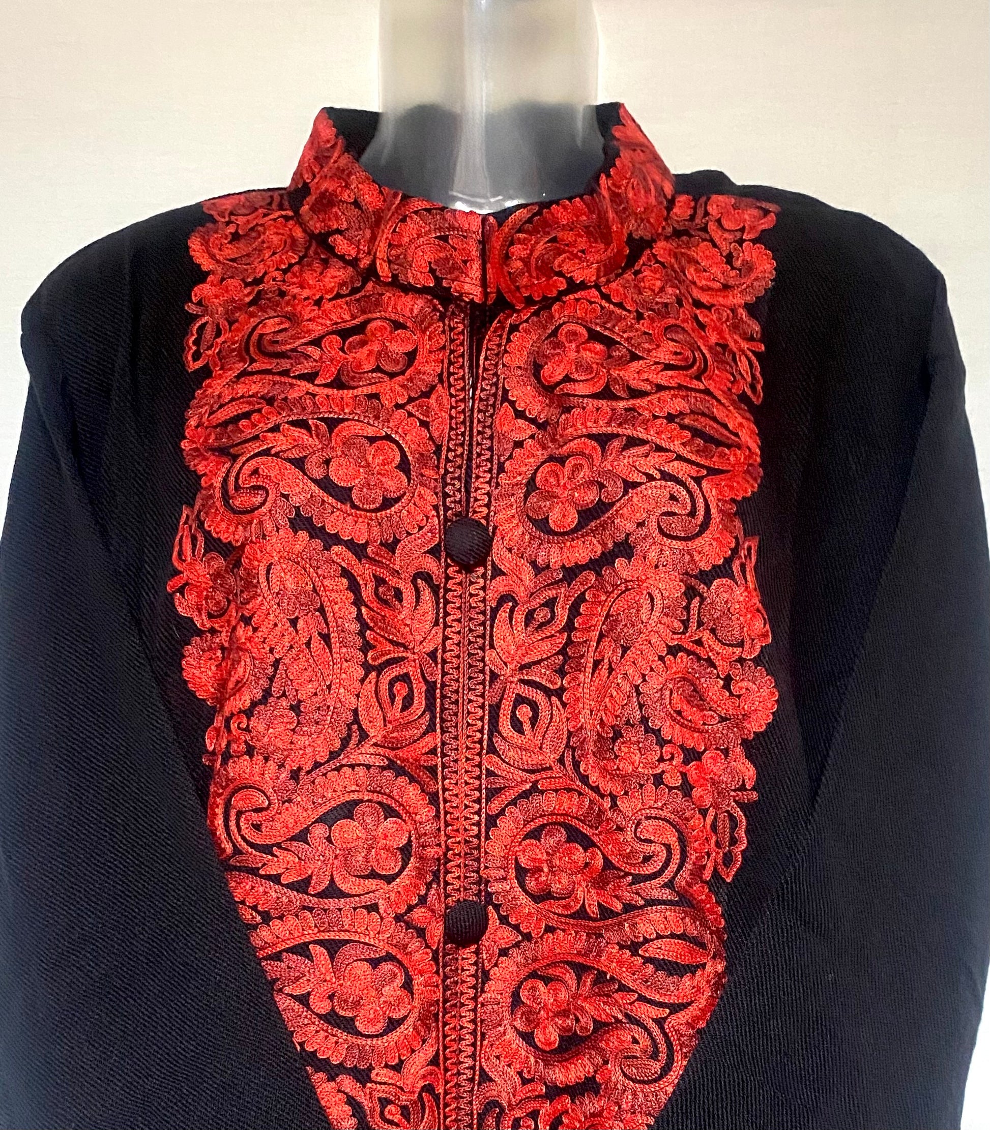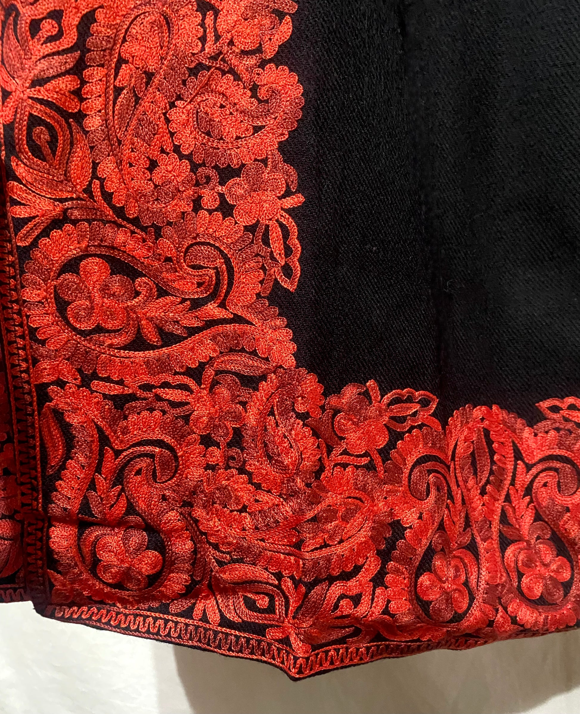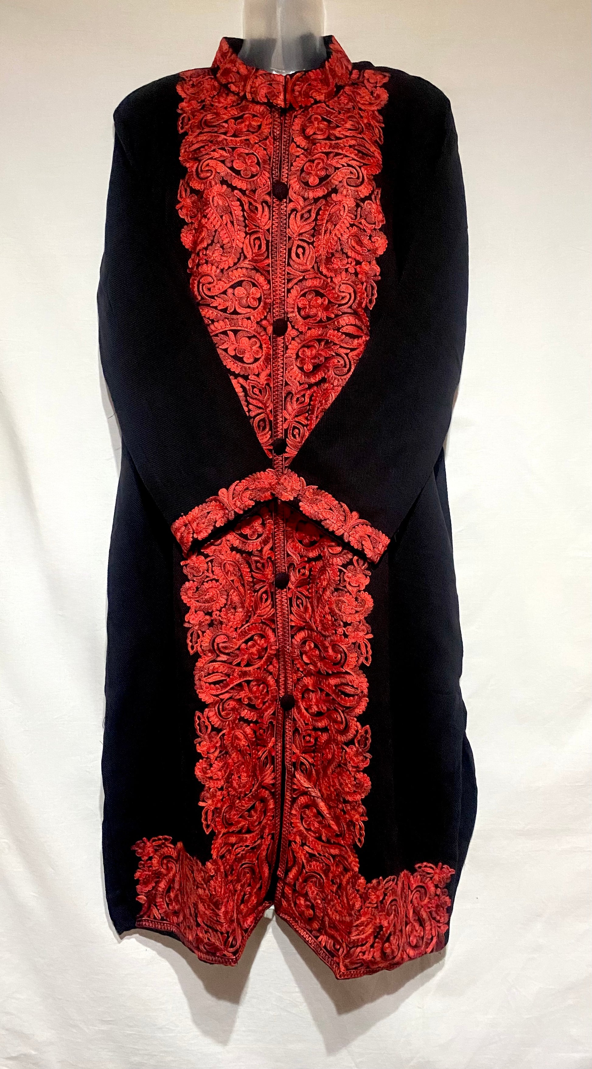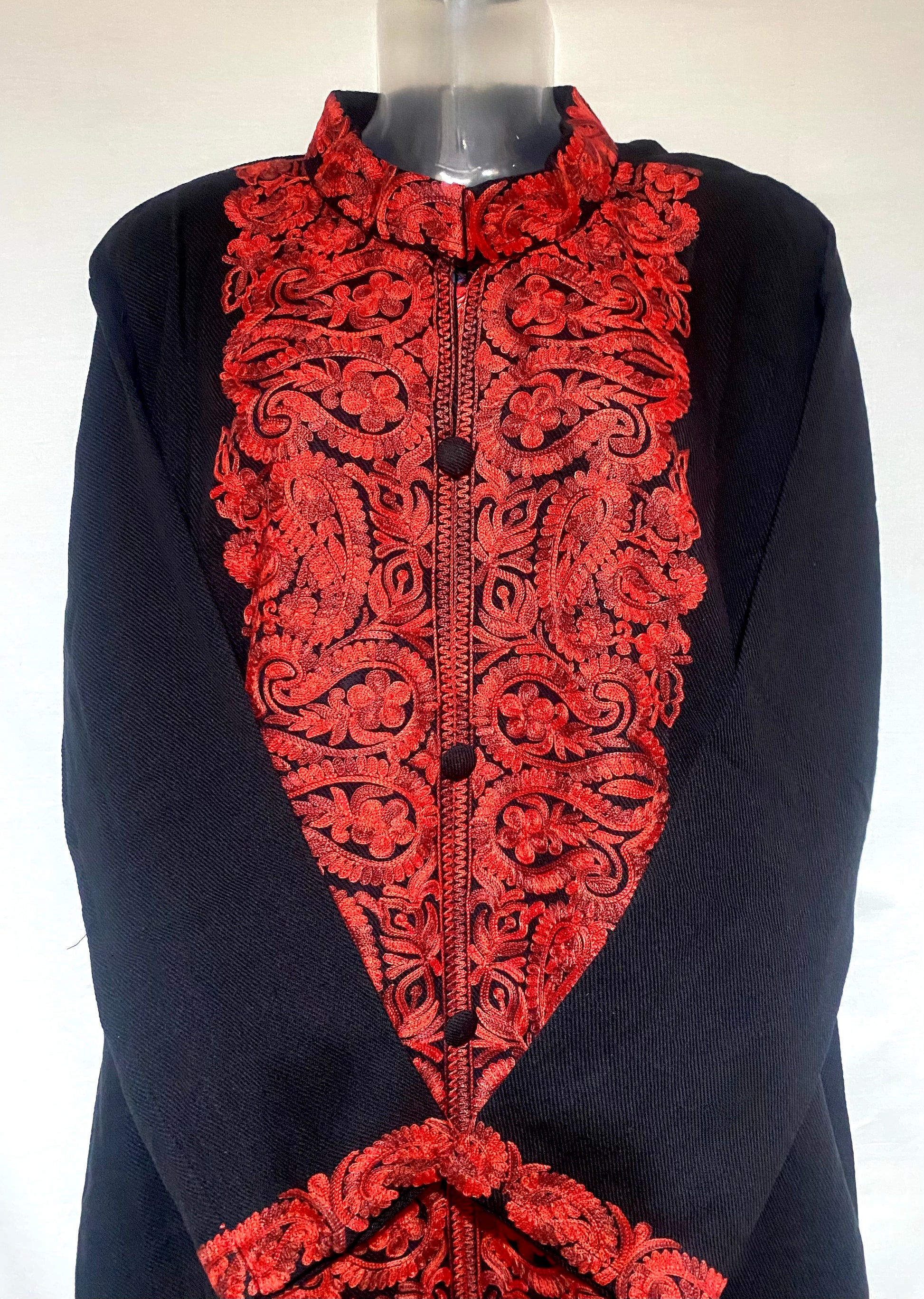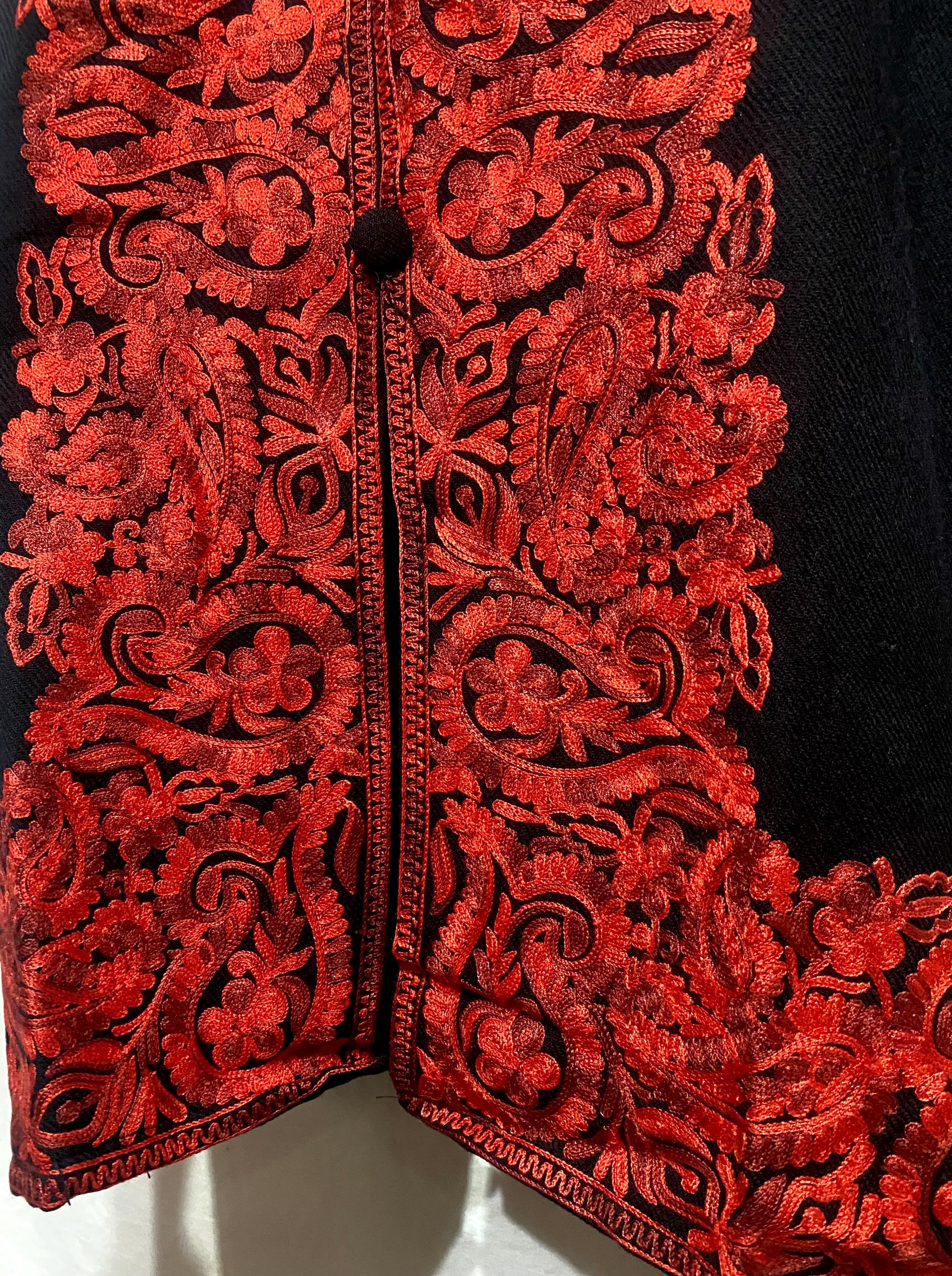 Inspired by winter blooms at dusk, the intricate red embroidery provides a vibrant pulse to this black coat.