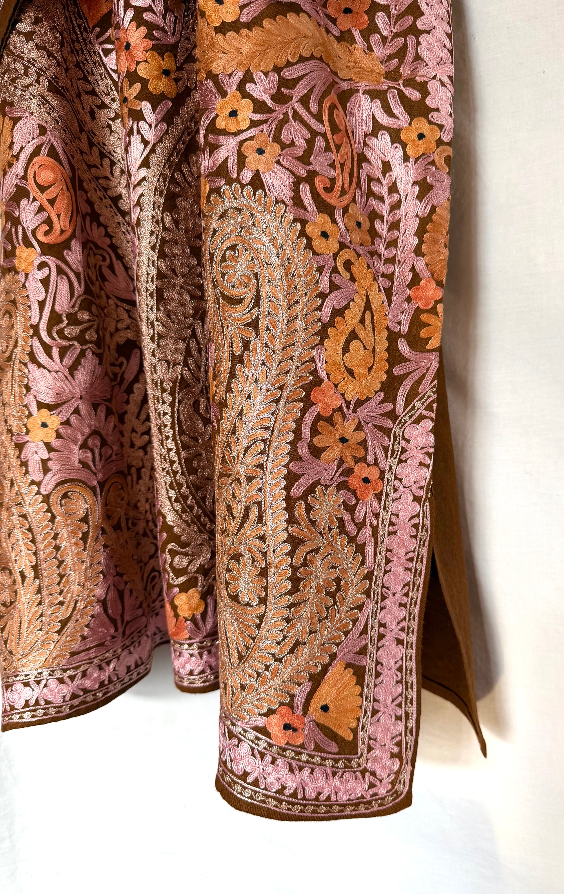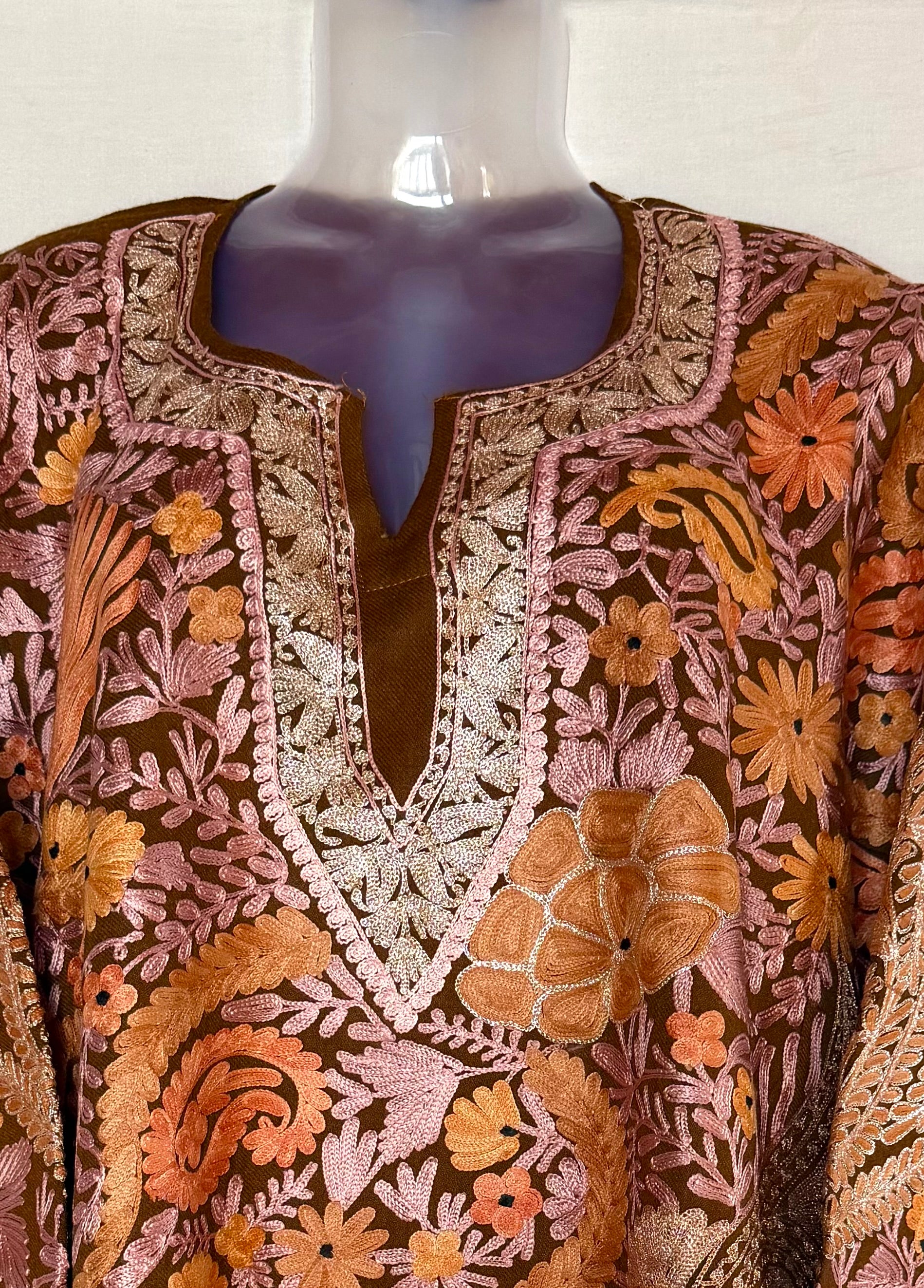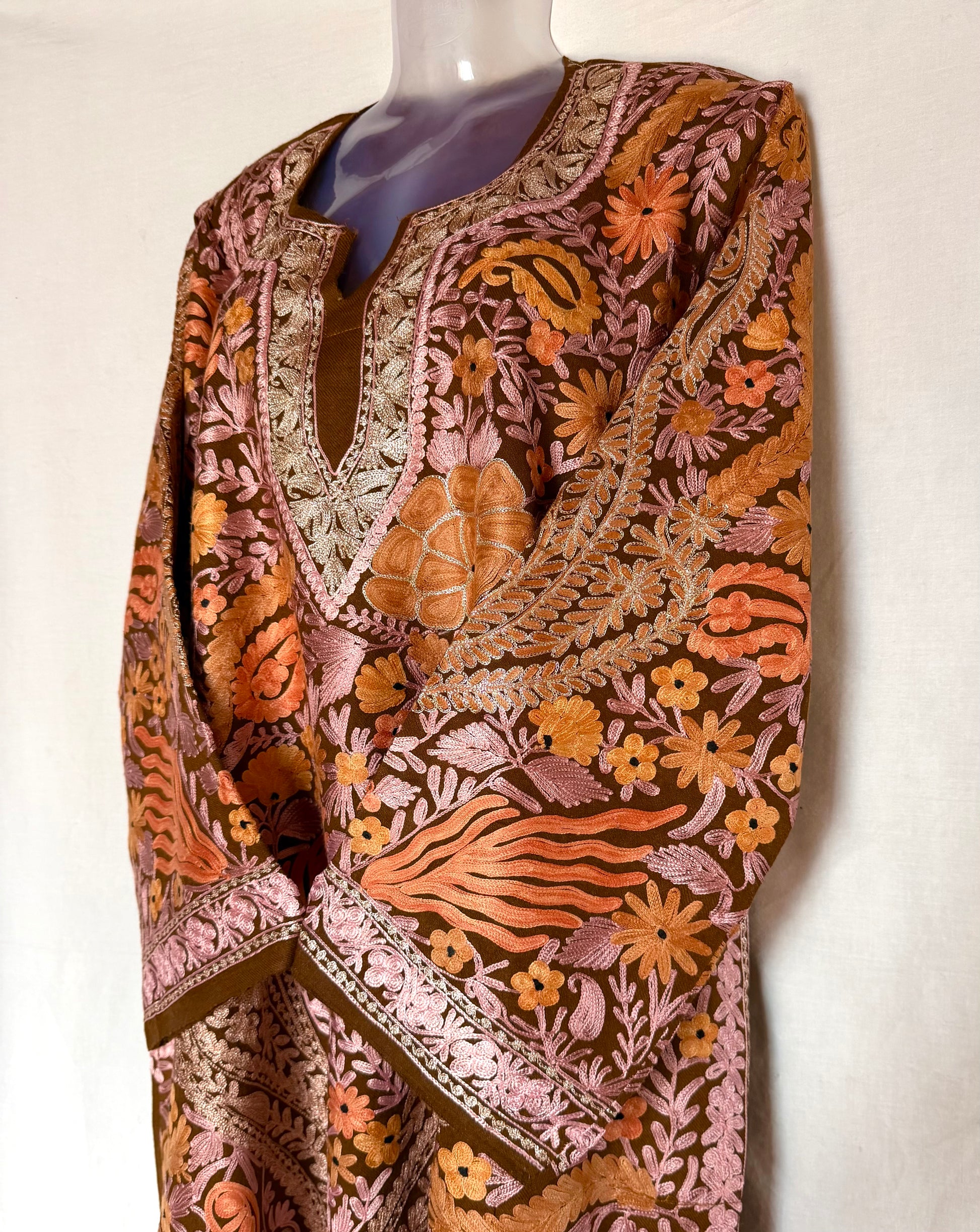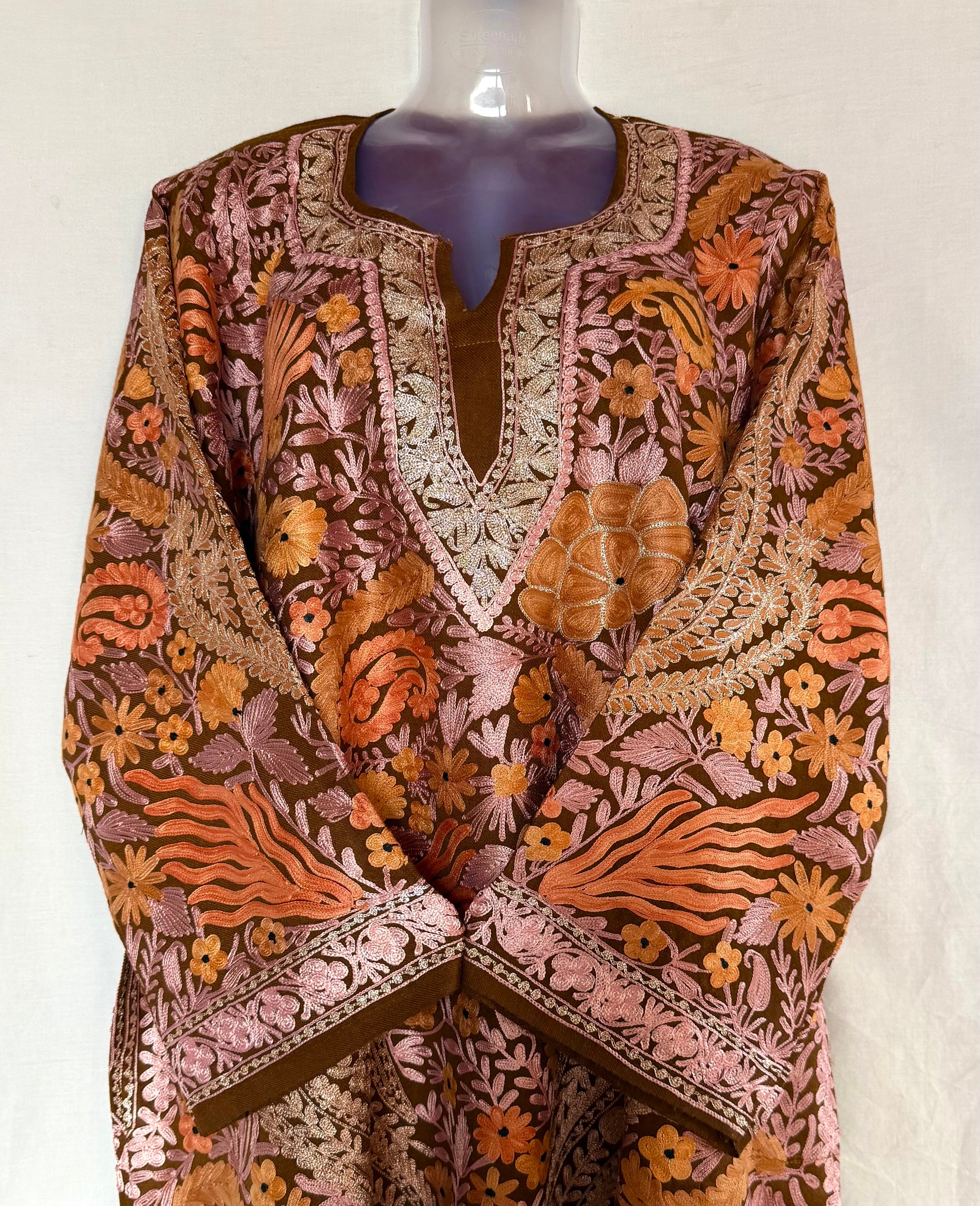 She looks graceful and captivating in her beautiful brown pheran, elegantly complemented by subtle touches of other rich colors that enhance its charm. The warm earthy tone of the brown fabric reflects timeless tradition, while the vibrant accents add a refreshing modern appeal.