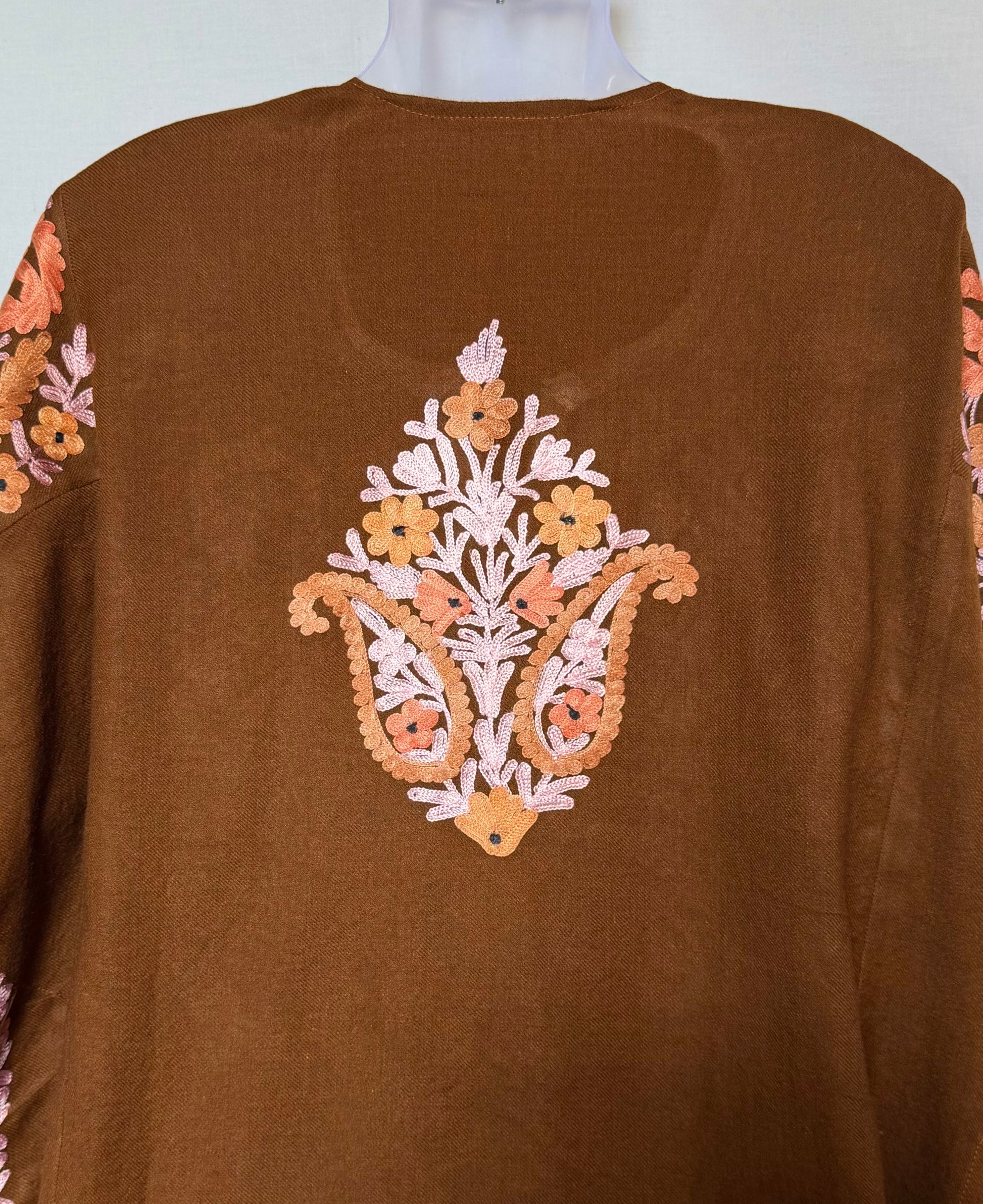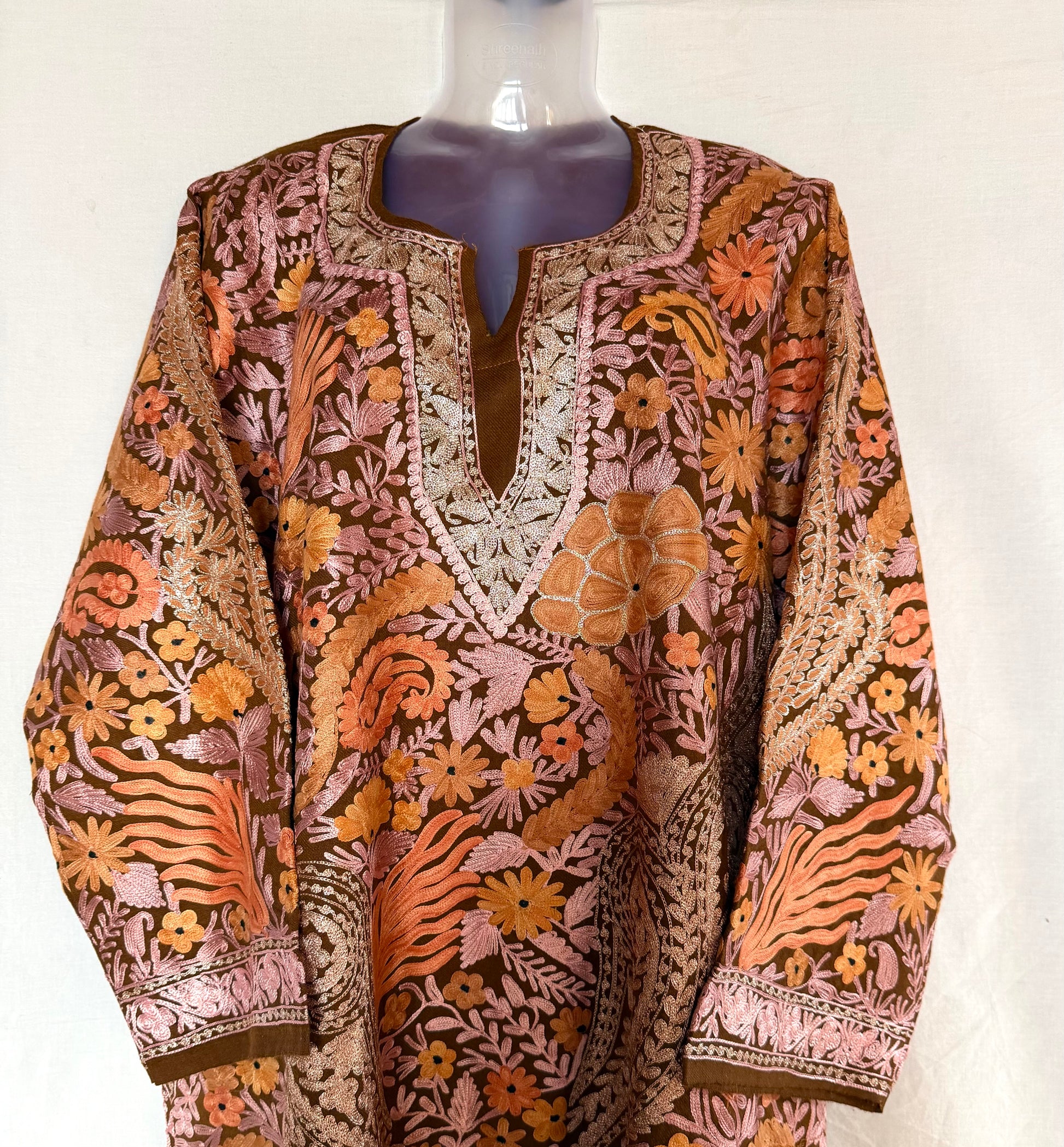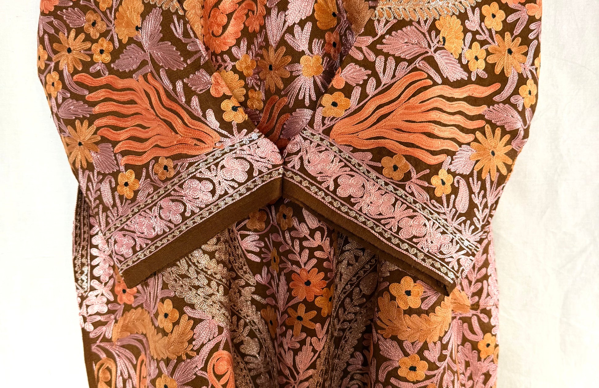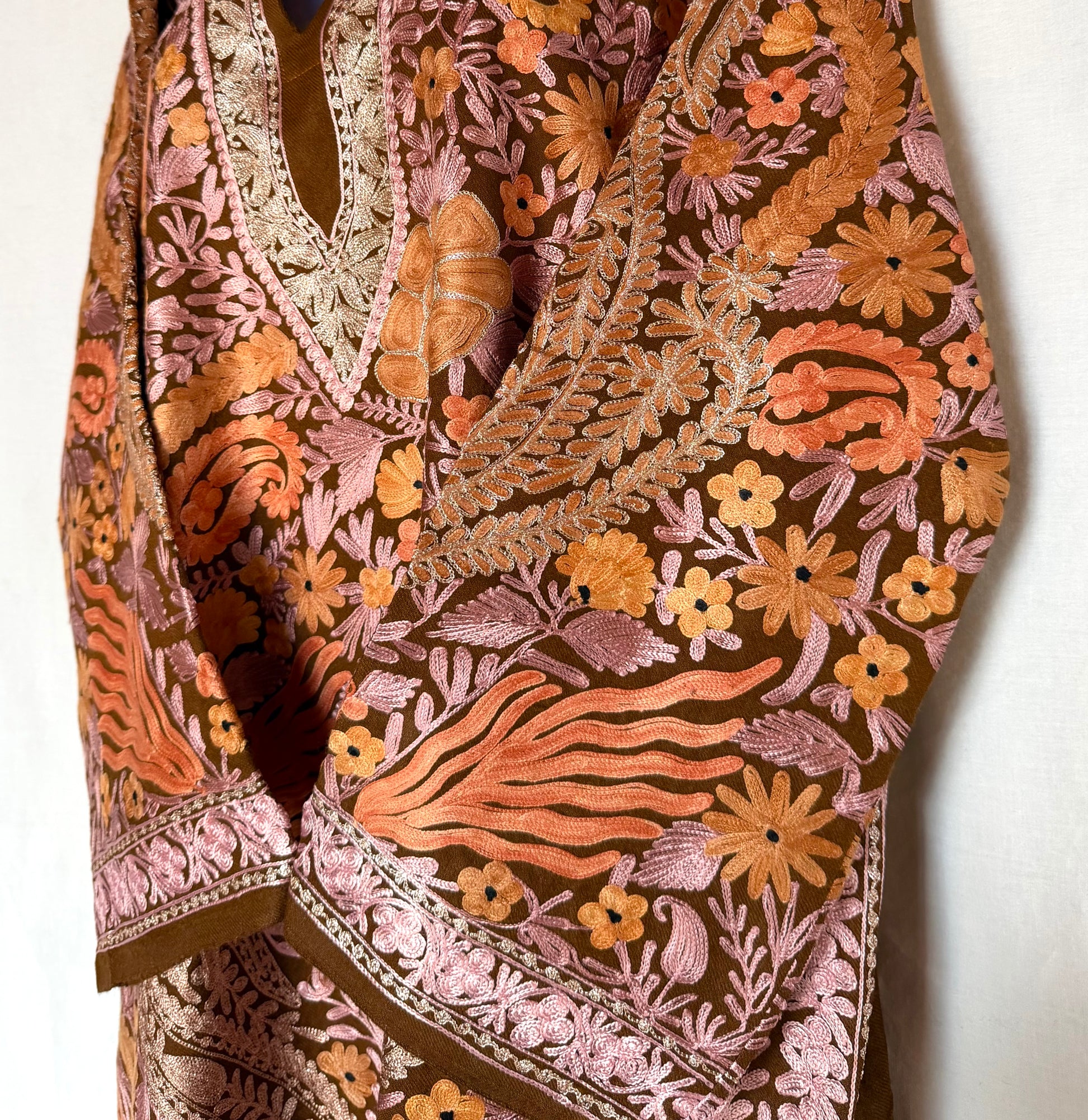 She looks graceful and captivating in her beautiful brown pheran, elegantly complemented by subtle touches of other rich colors that enhance its charm. The warm earthy tone of the brown fabric reflects timeless tradition, while the vibrant accents add a refreshing modern appeal.