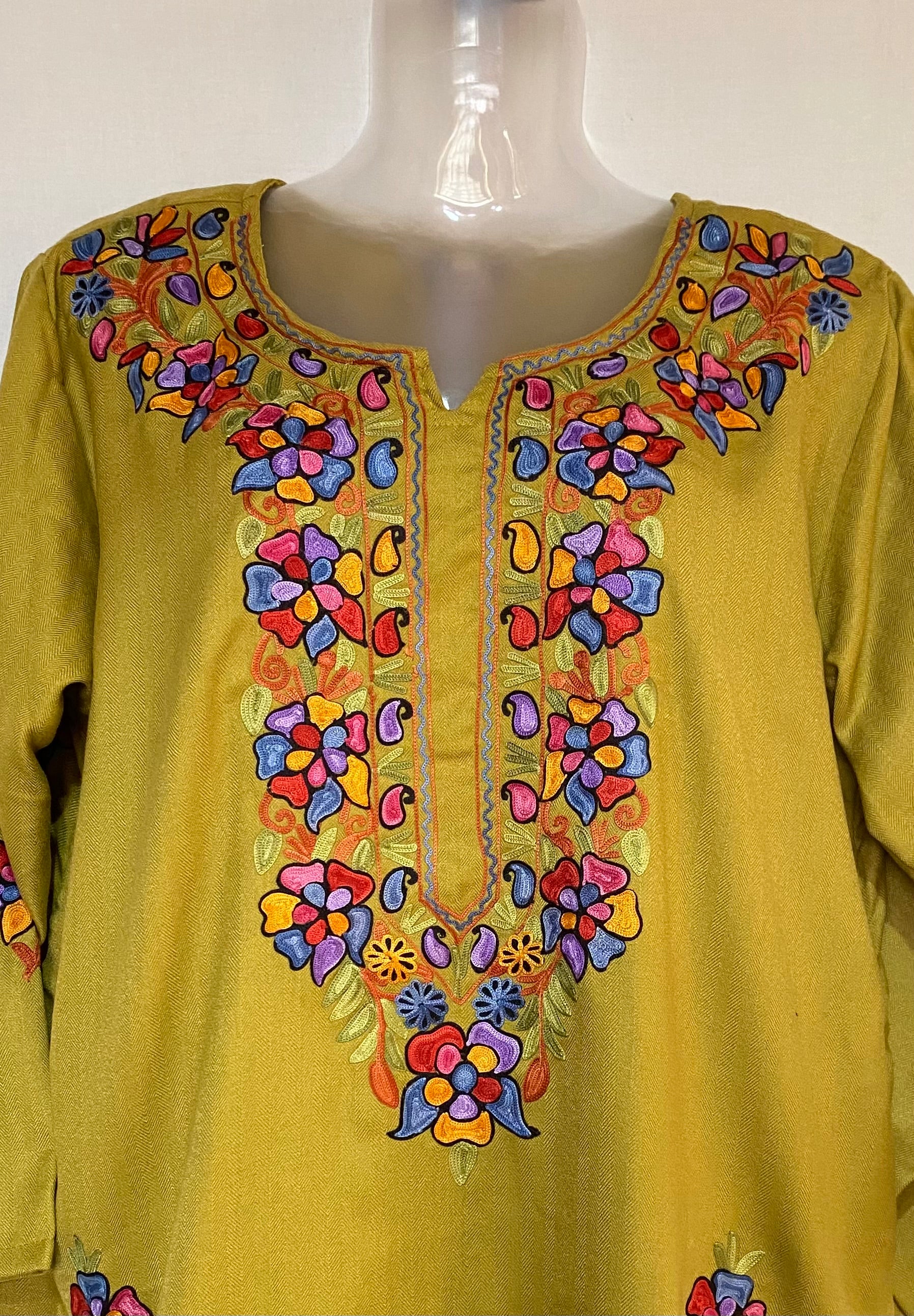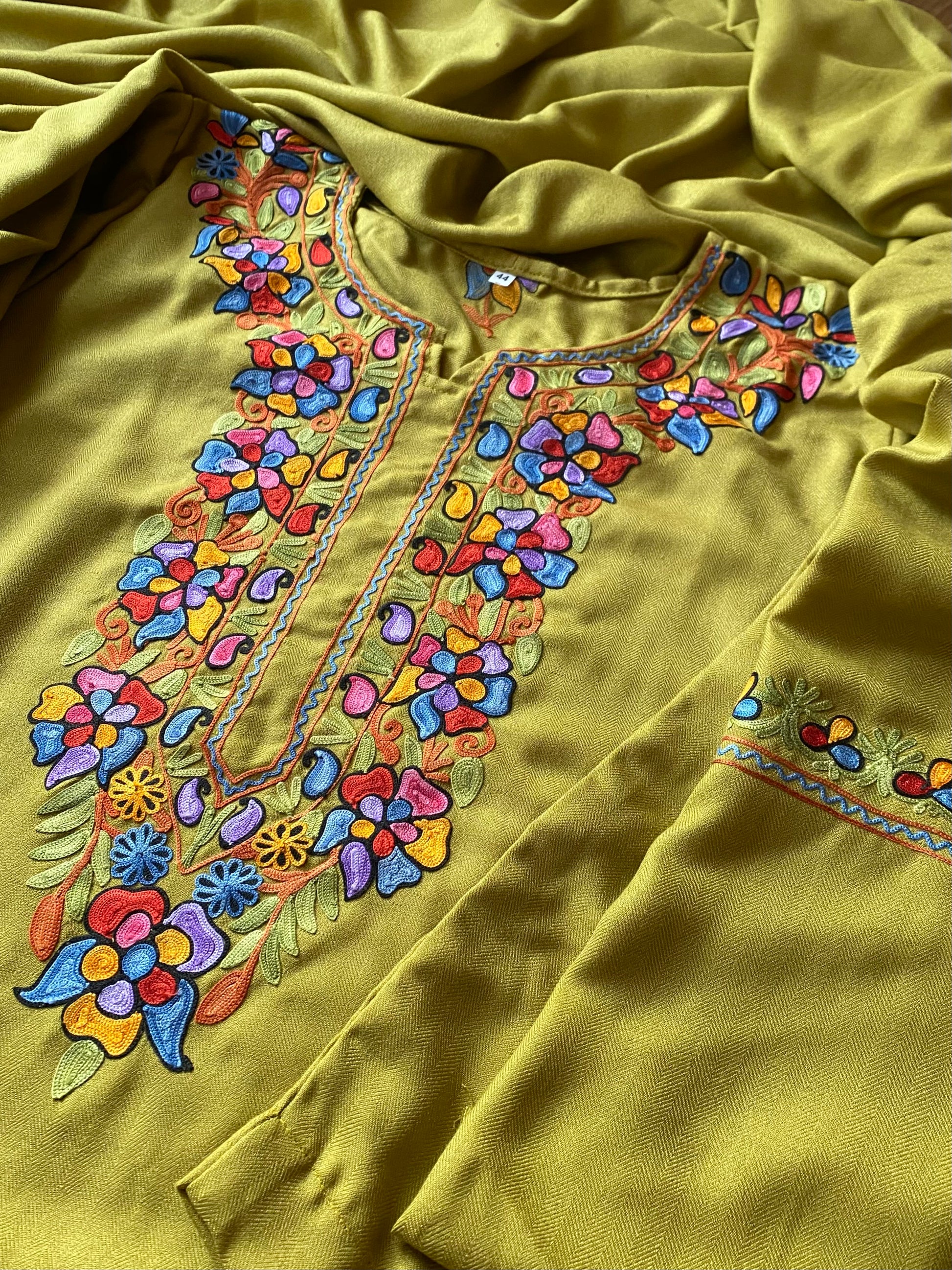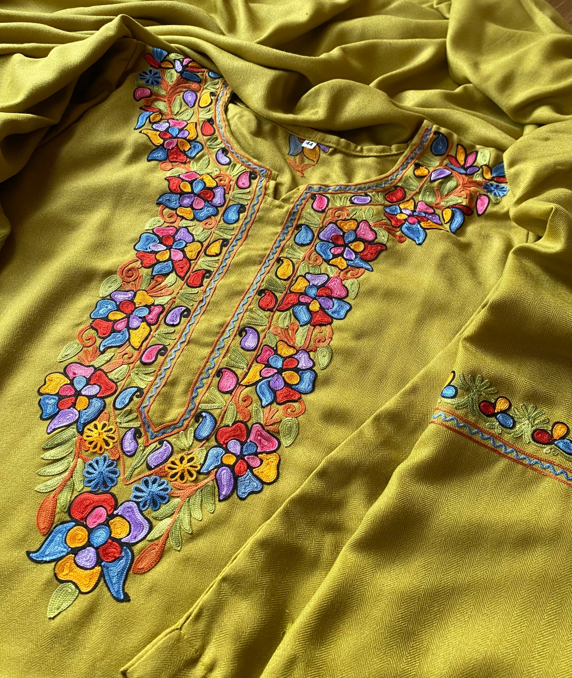 Elevate your winter ethnic look with this 3-piece stitched mehndi green woollen kurta set, featuring exquisite embroidery for a touch of elegance.