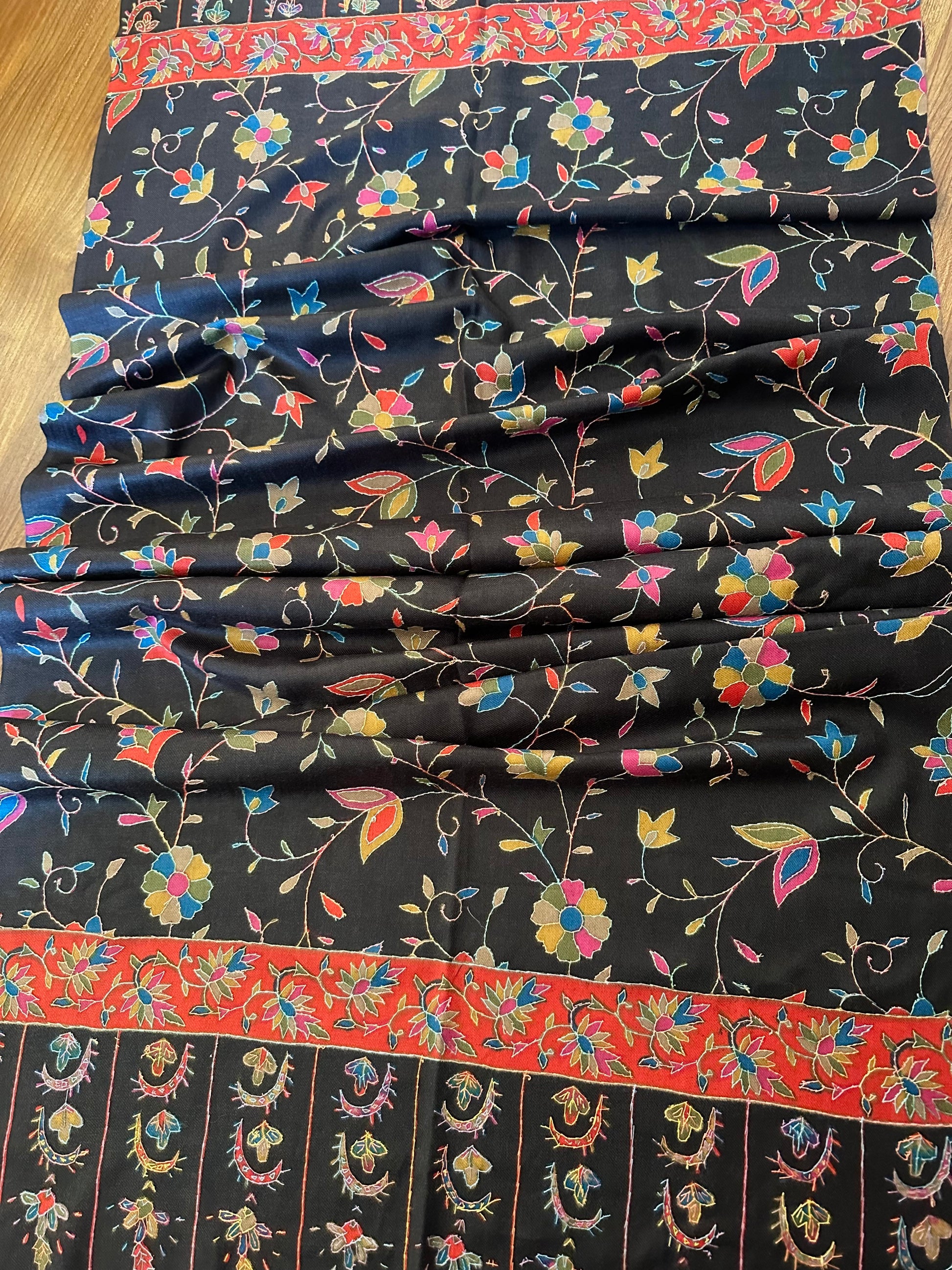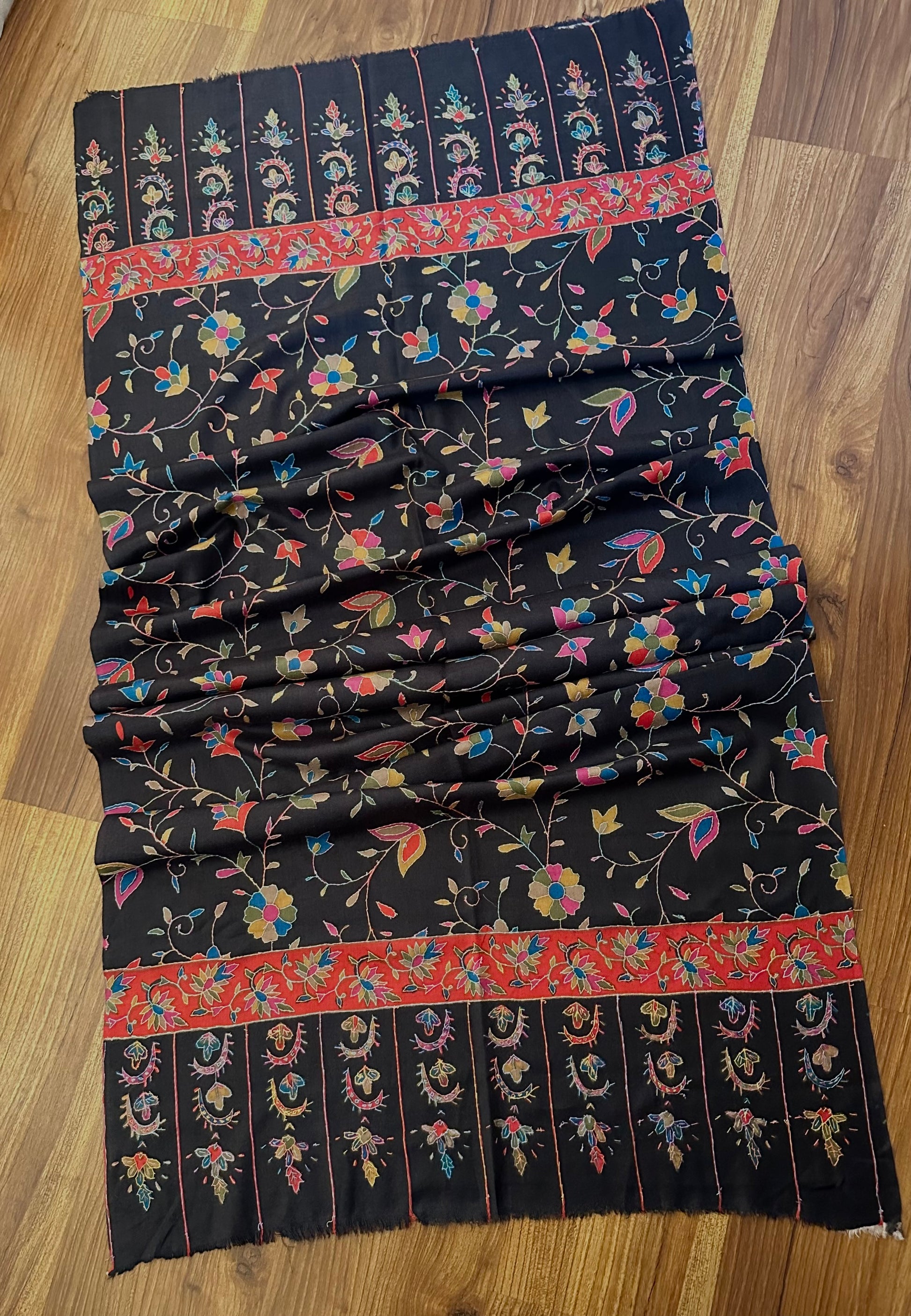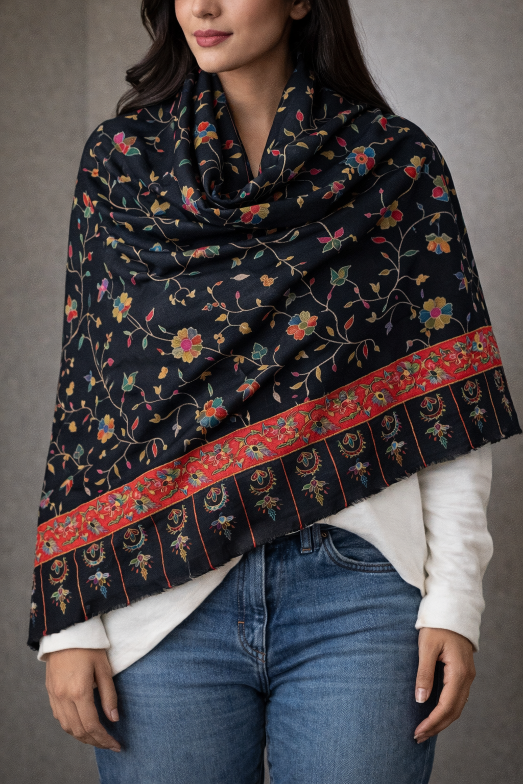 In this Black Kalamkari Stole the rich black base highlights the colorful threads, creating a striking play of depth and detail.