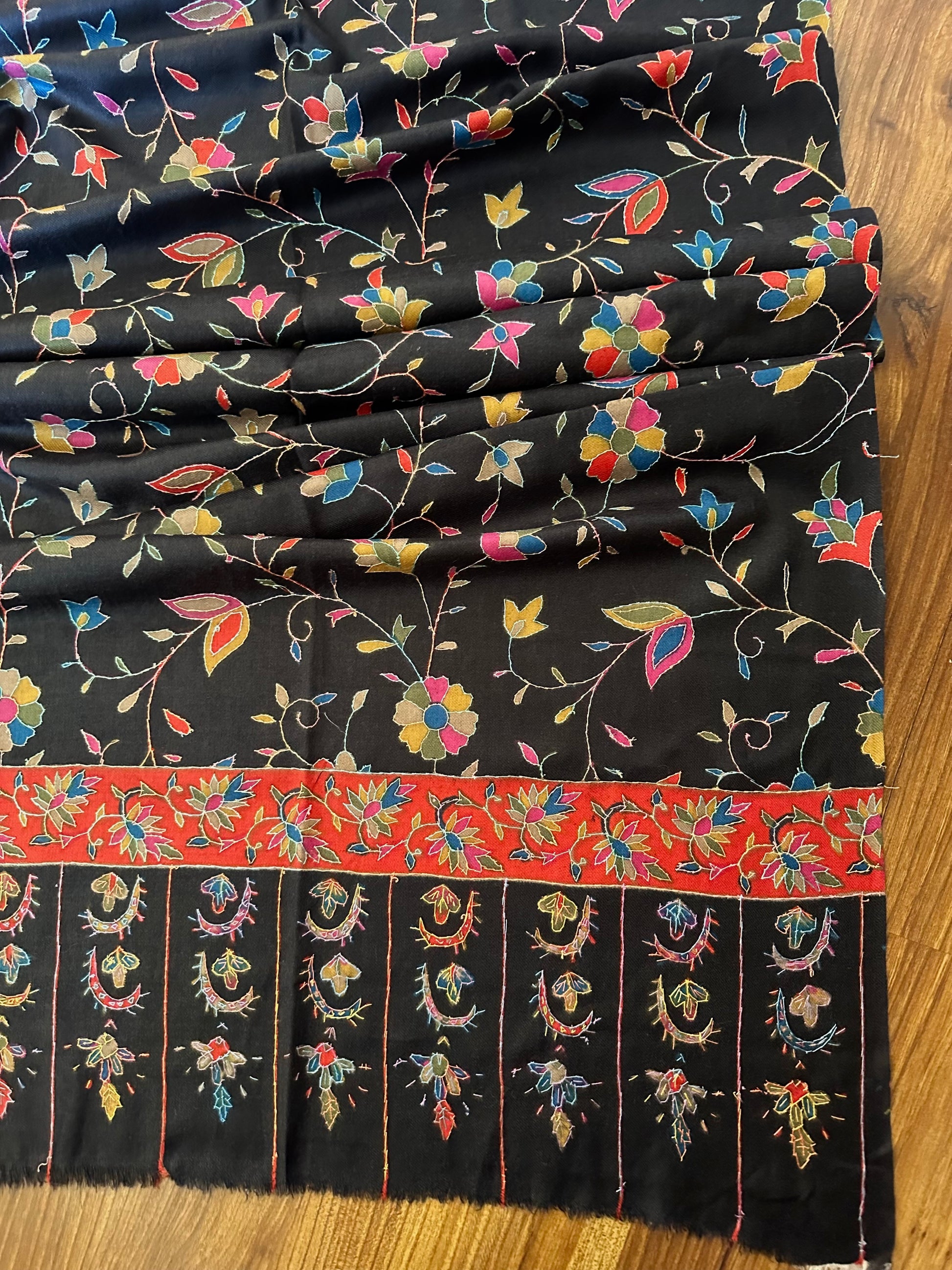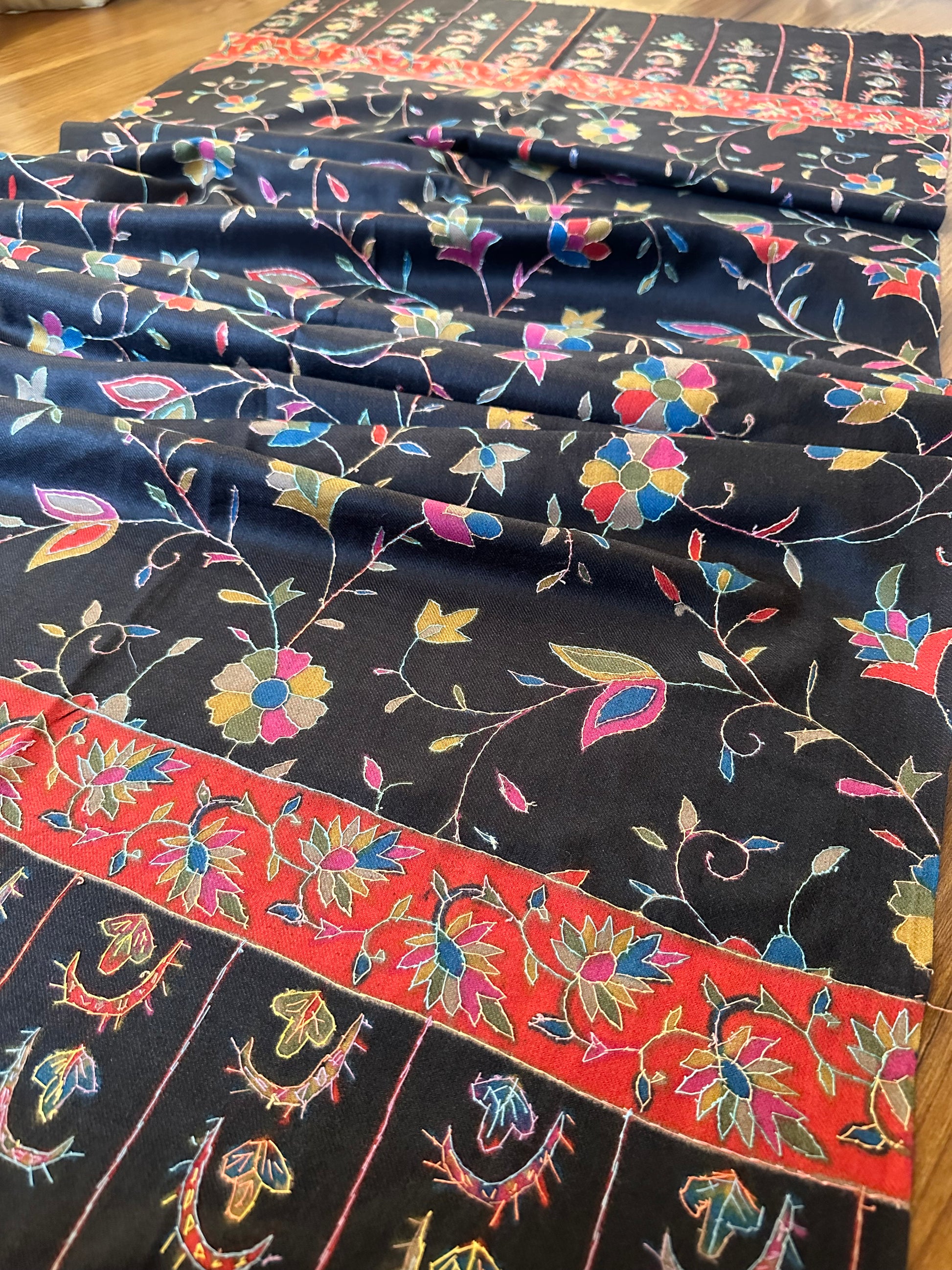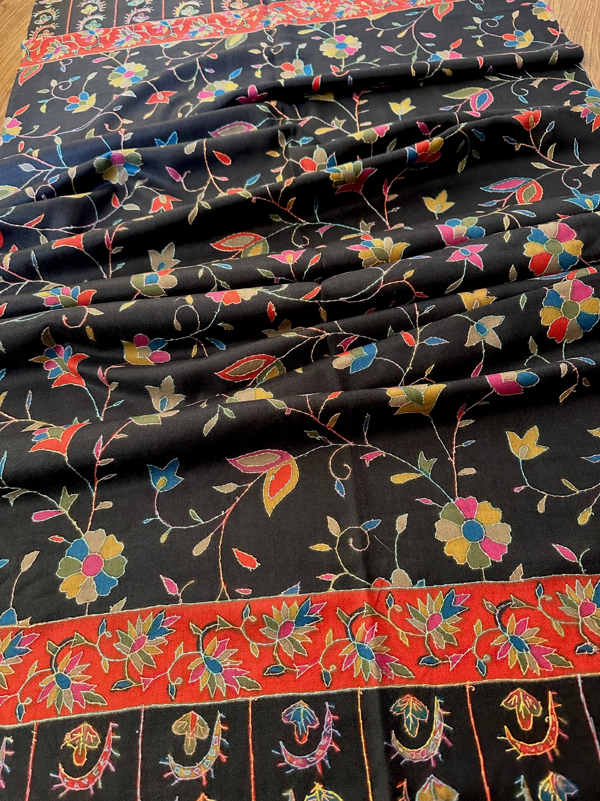 In this Black Kalamkari Stole the rich black base highlights the colorful threads, creating a striking play of depth and detail.