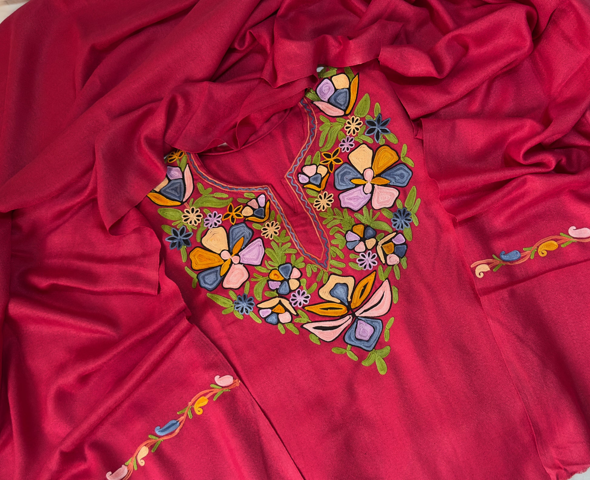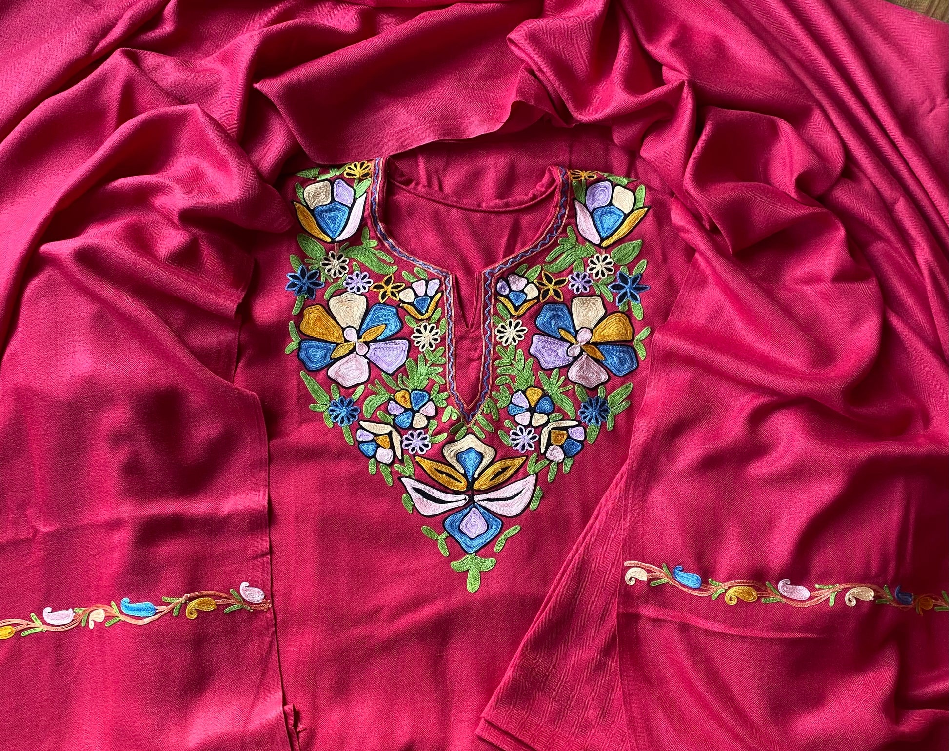 This 3-piece stitched magenta woollen kurta set with elegant embroidery on kurta and dupatta brings together warmth and festive charm in one stunning ensemble.