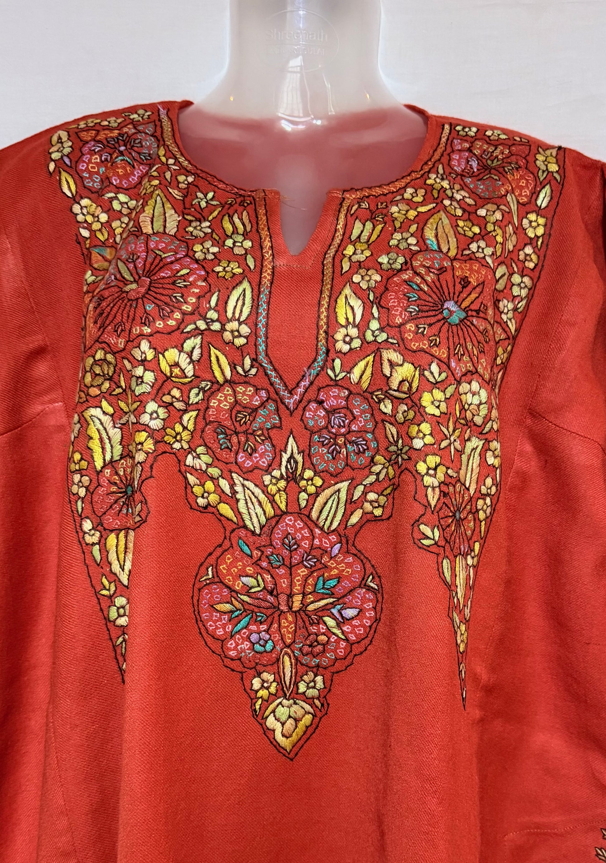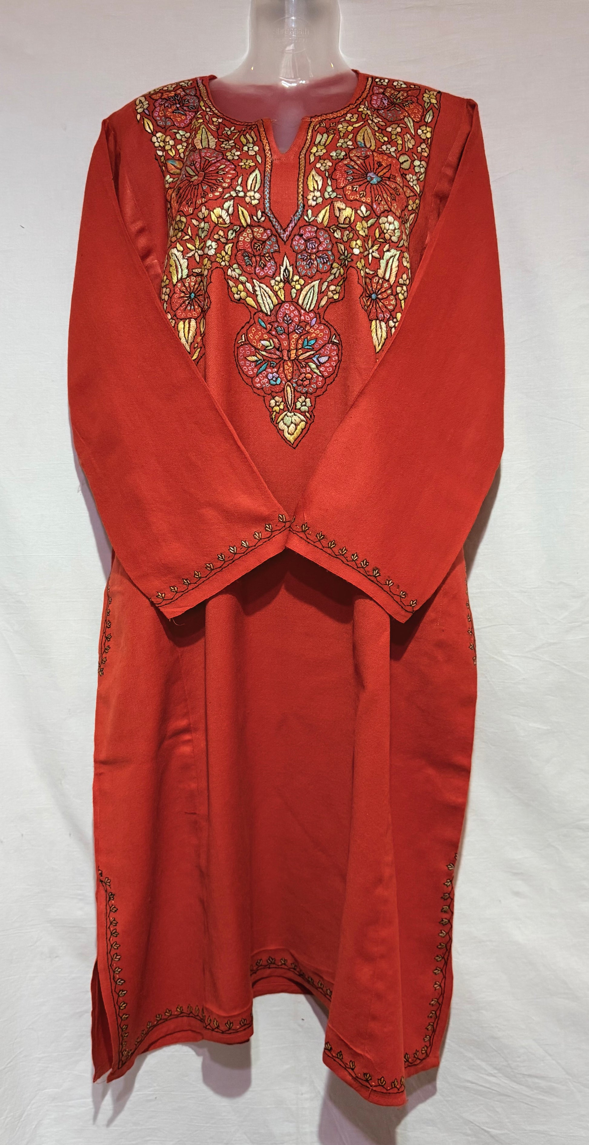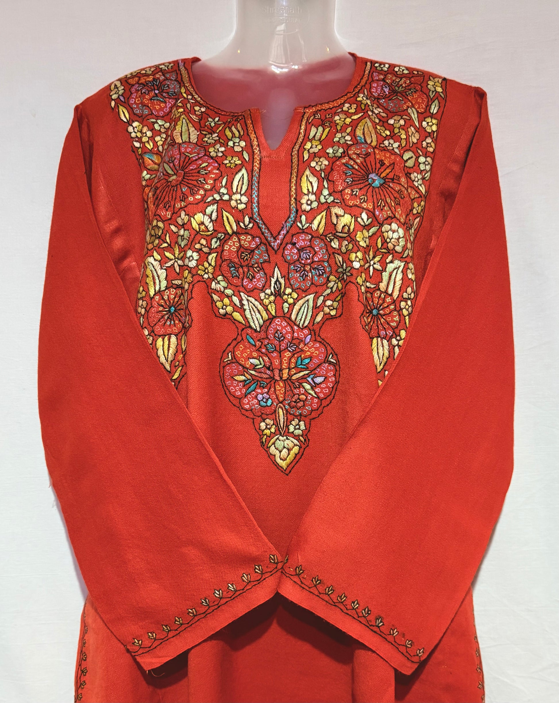 This beautifully crafted raffal pheran with hand sozni embroidery showcases the perfect blend of tradition and artistry. Every delicate stitch is thoughtfully done by skilled craftsmen, adding intricate patterns that enhance the richness of the fabric.