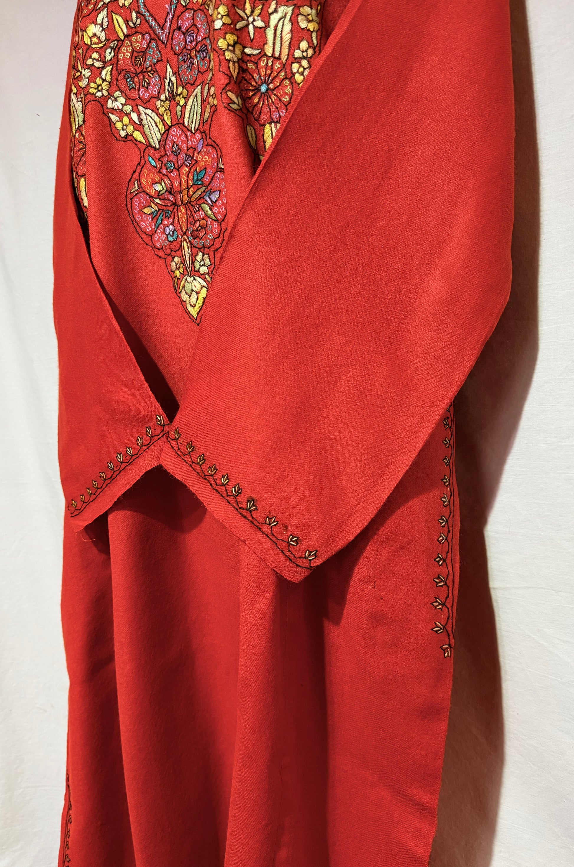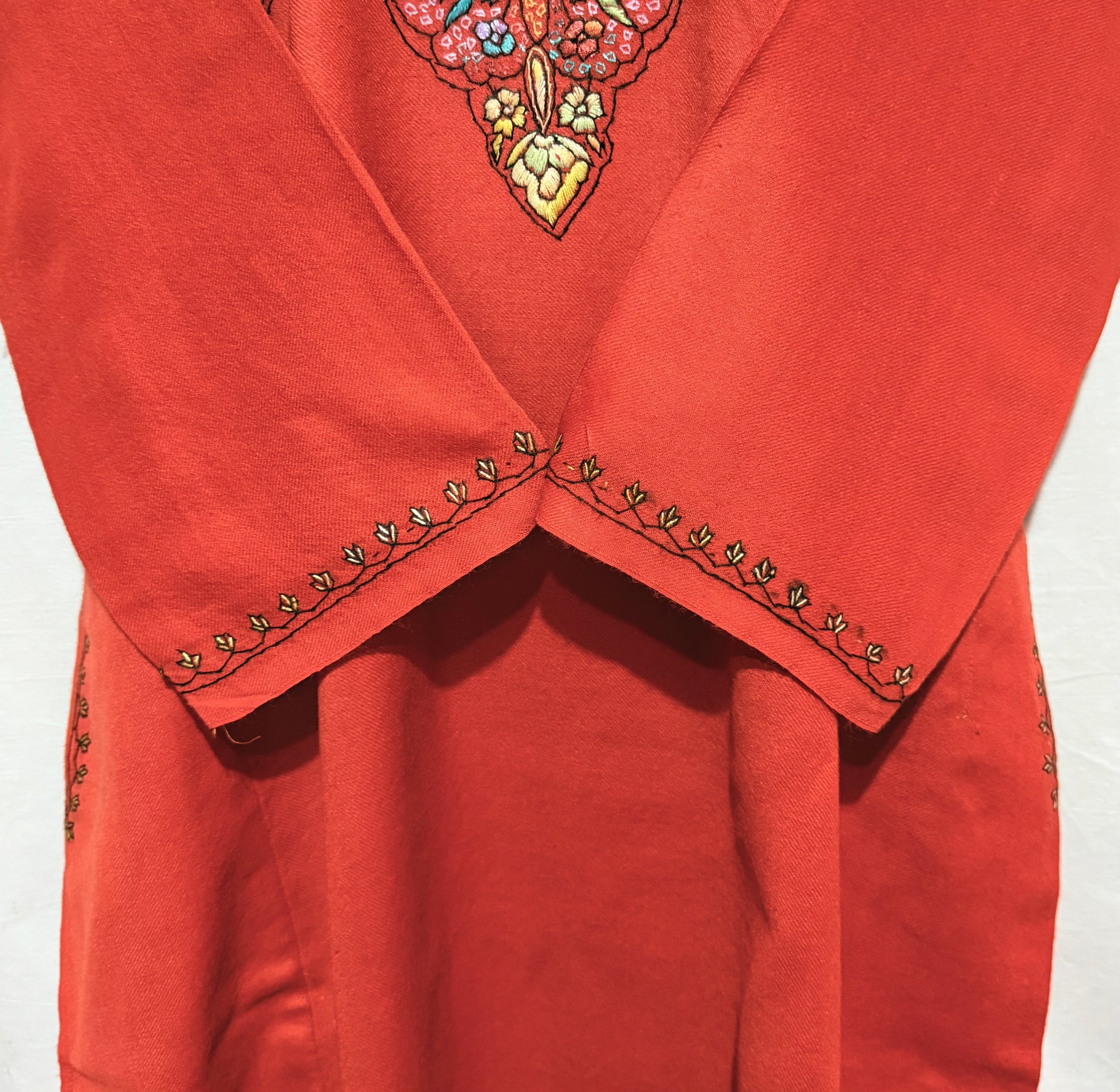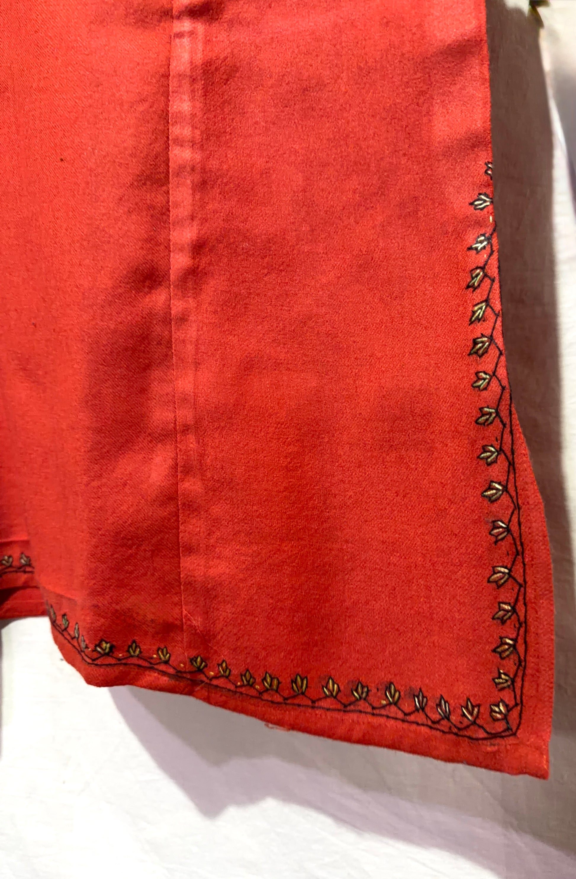 This beautifully crafted raffal pheran with hand sozni embroidery showcases the perfect blend of tradition and artistry. Every delicate stitch is thoughtfully done by skilled craftsmen, adding intricate patterns that enhance the richness of the fabric.