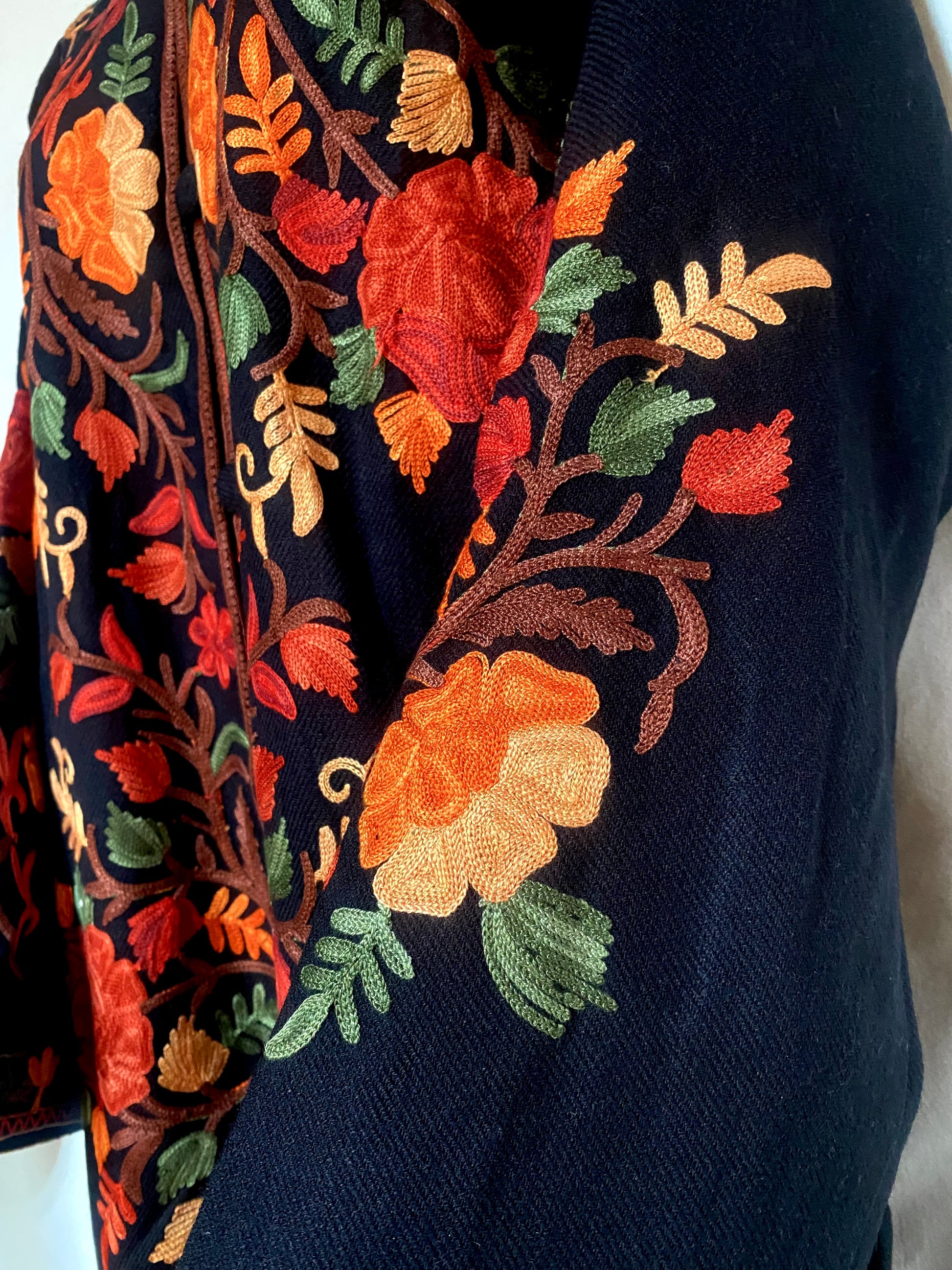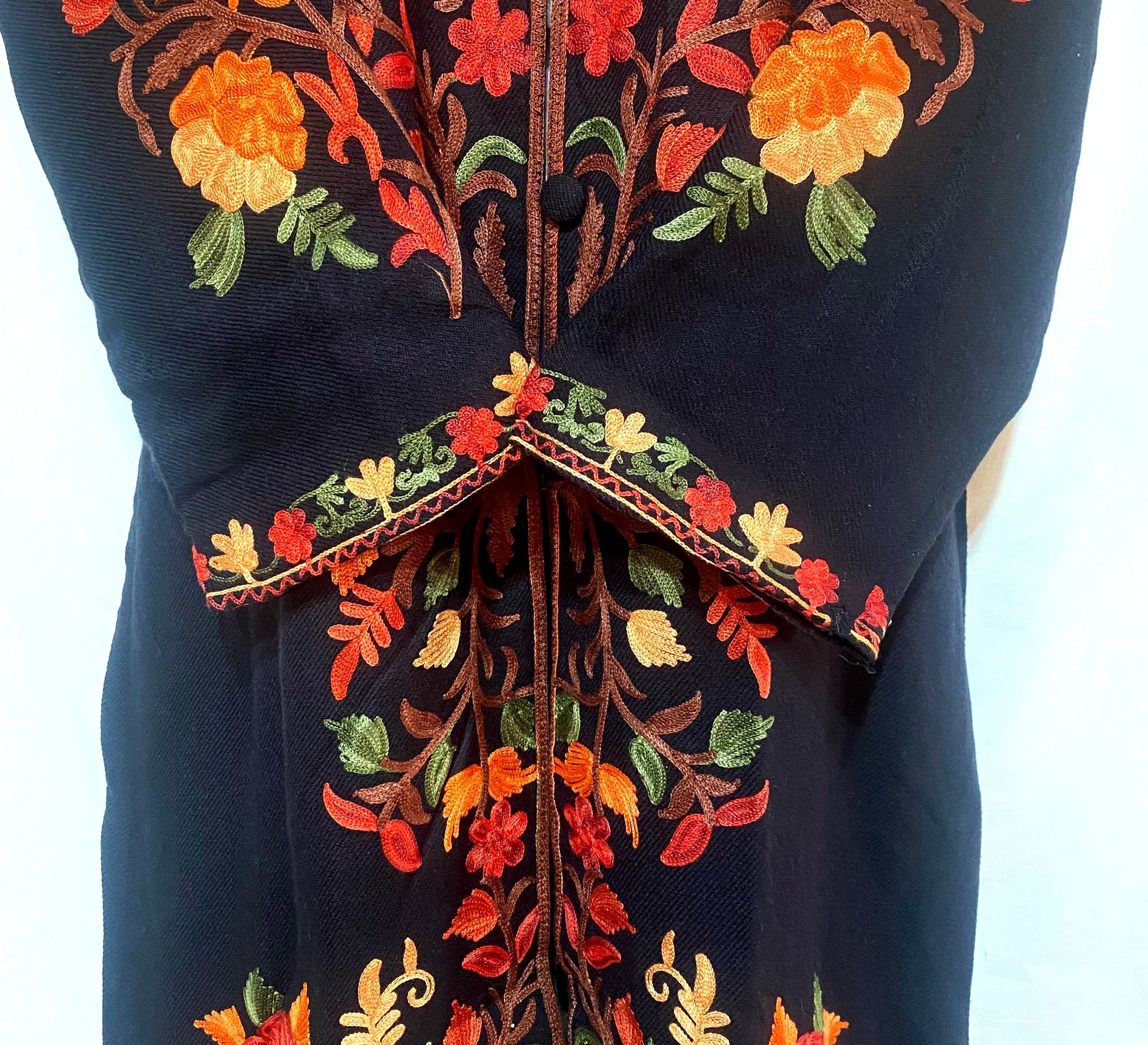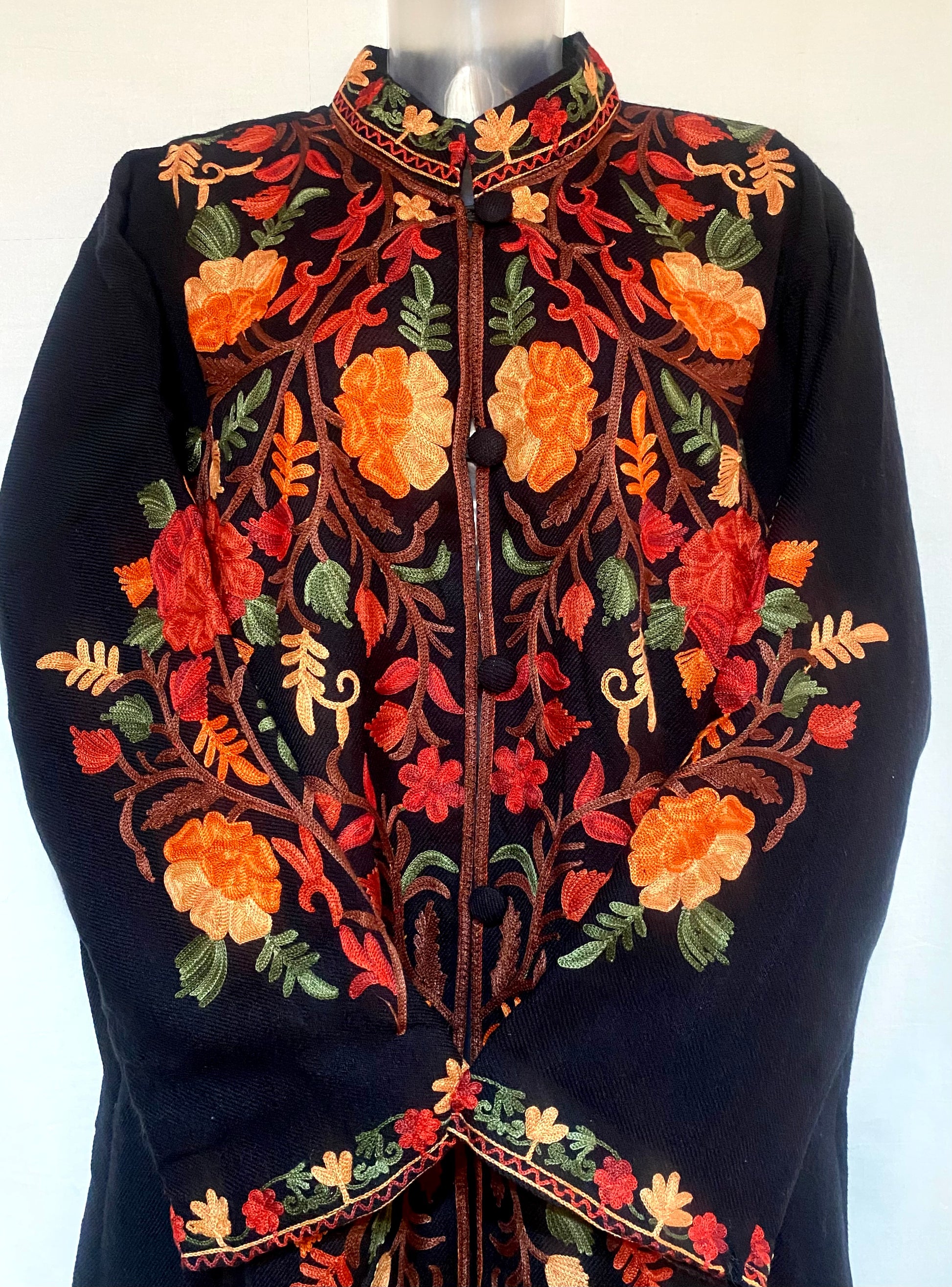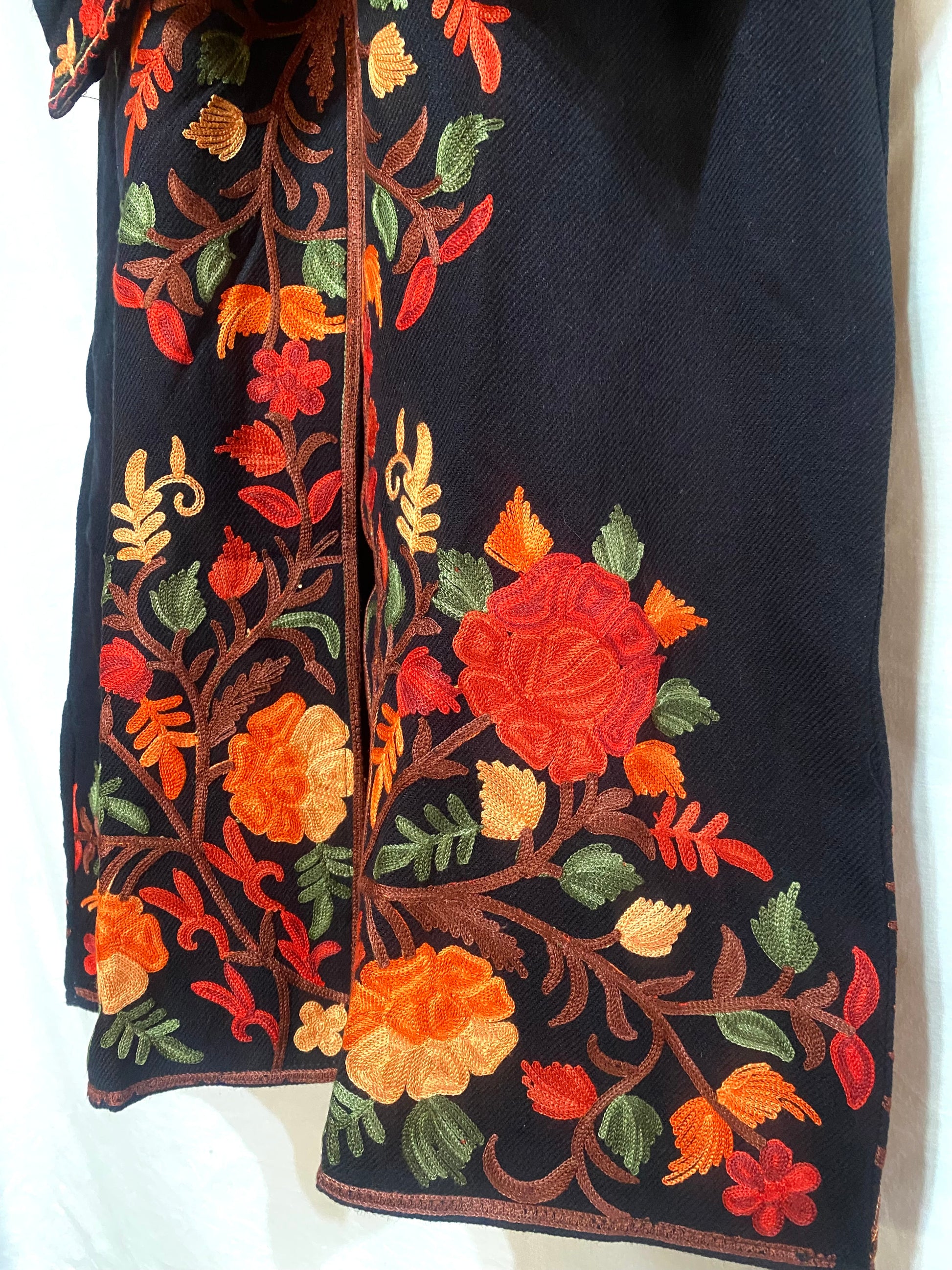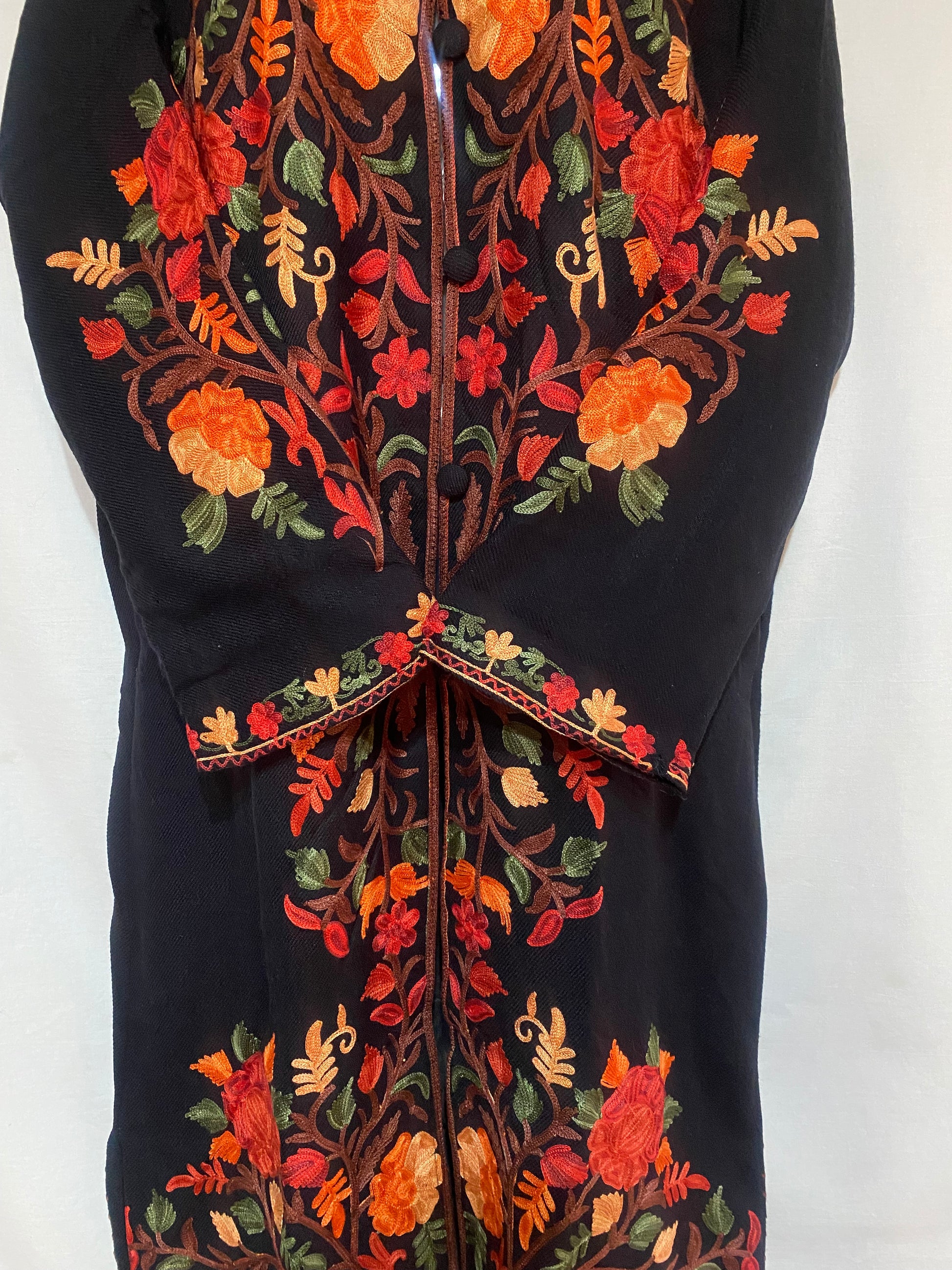 Draped in deep black, this black long woollen coat is adorned with exquisite multicolor embroidery, blending rich craftsmanship with modern elegance.