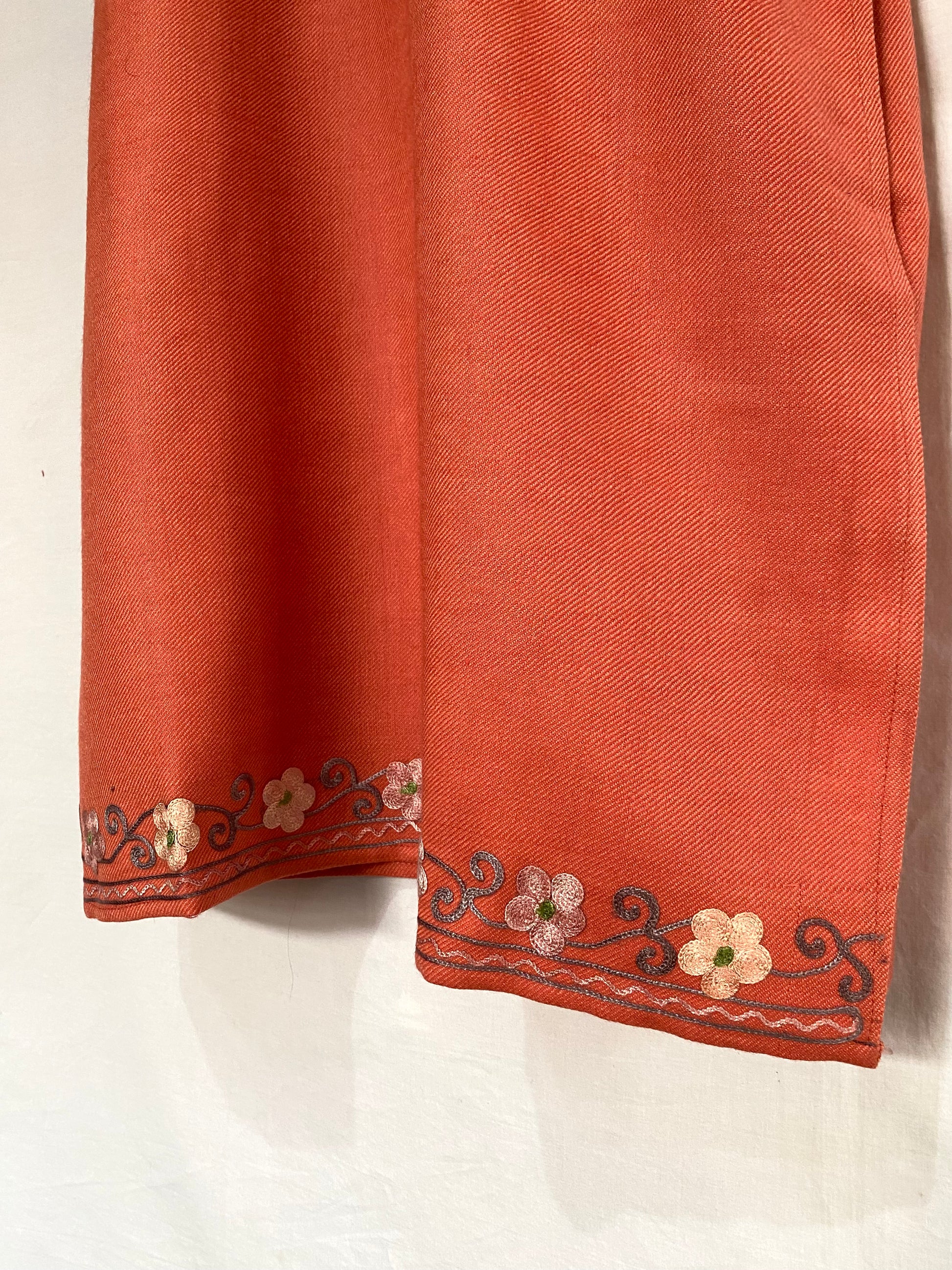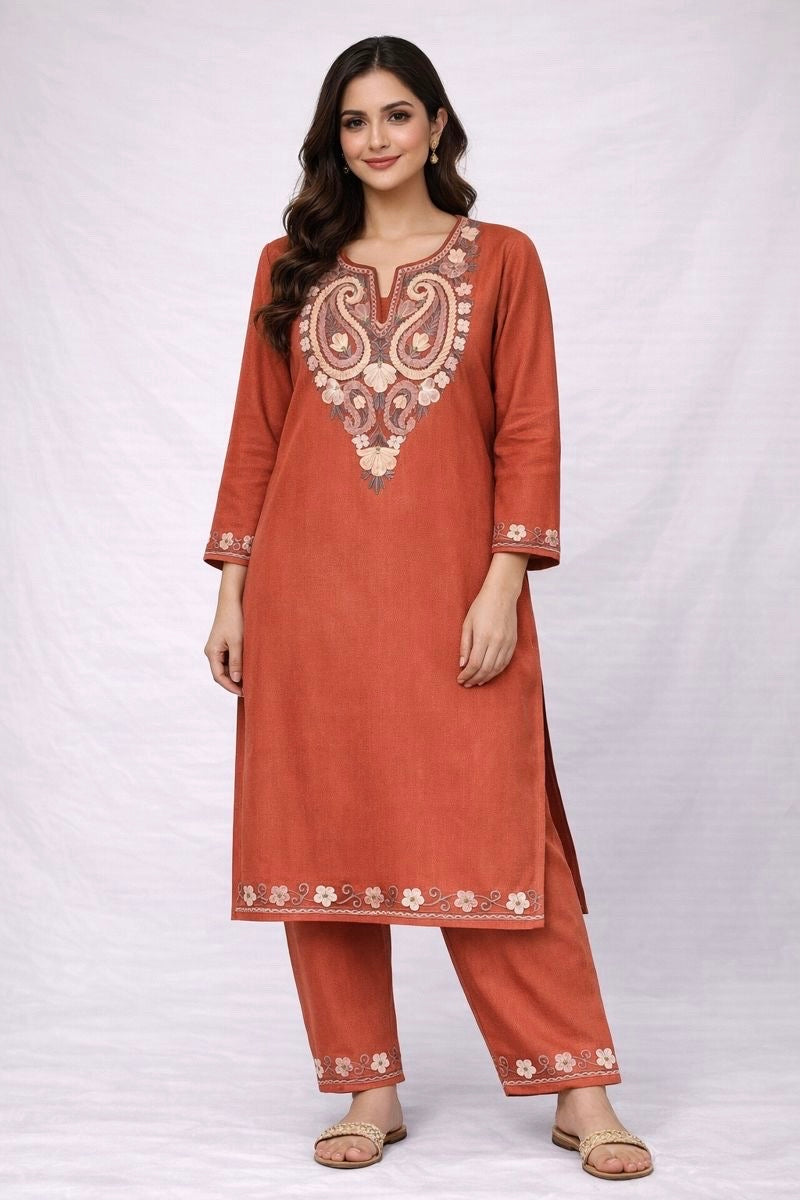 This peach-colored winter co-ord set with intricate embroidery is the perfect blend of warmth, elegance, and traditional charm. Crafted from premium winter fabric, it offers cozy comfort while maintaining a rich, regal look.