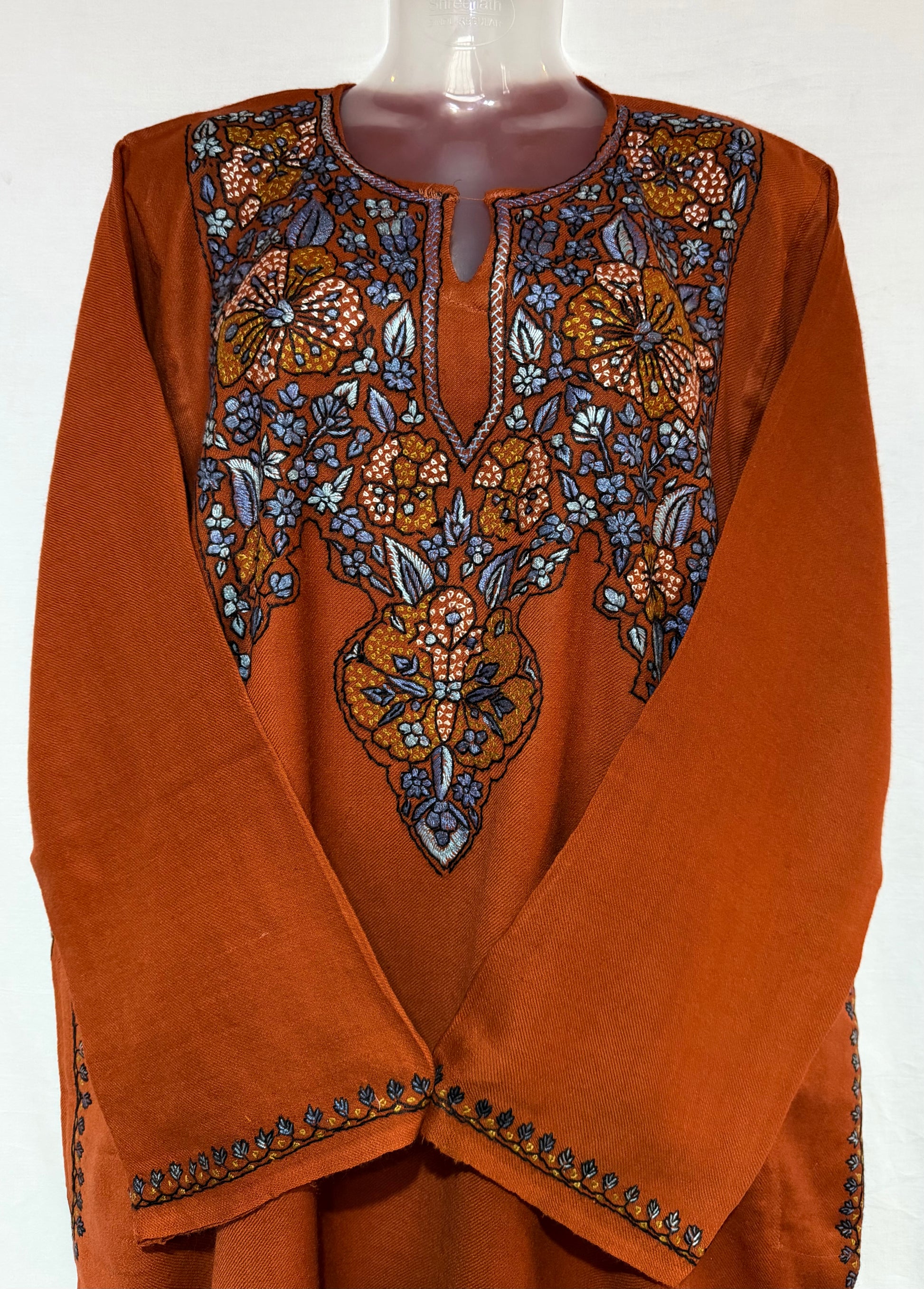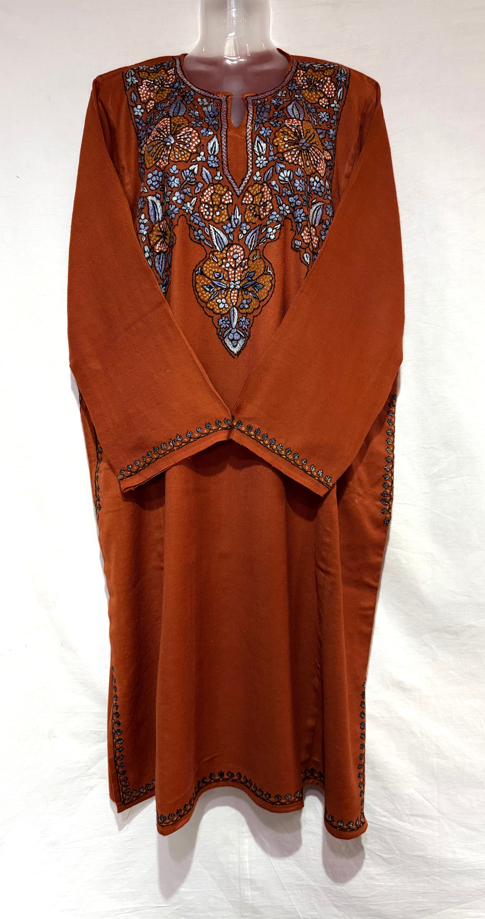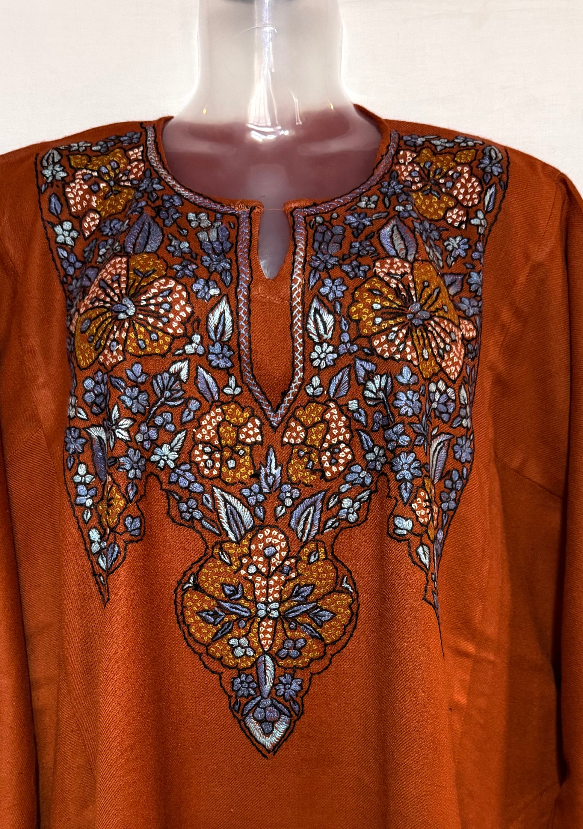 This exquisite pheran with hand sozni embroidery is a true masterpiece of traditional craftsmanship and timeless elegance. Carefully handcrafted by skilled artisans, the intricate embroidery adds depth, texture, and artistic beauty to the rich fabric.