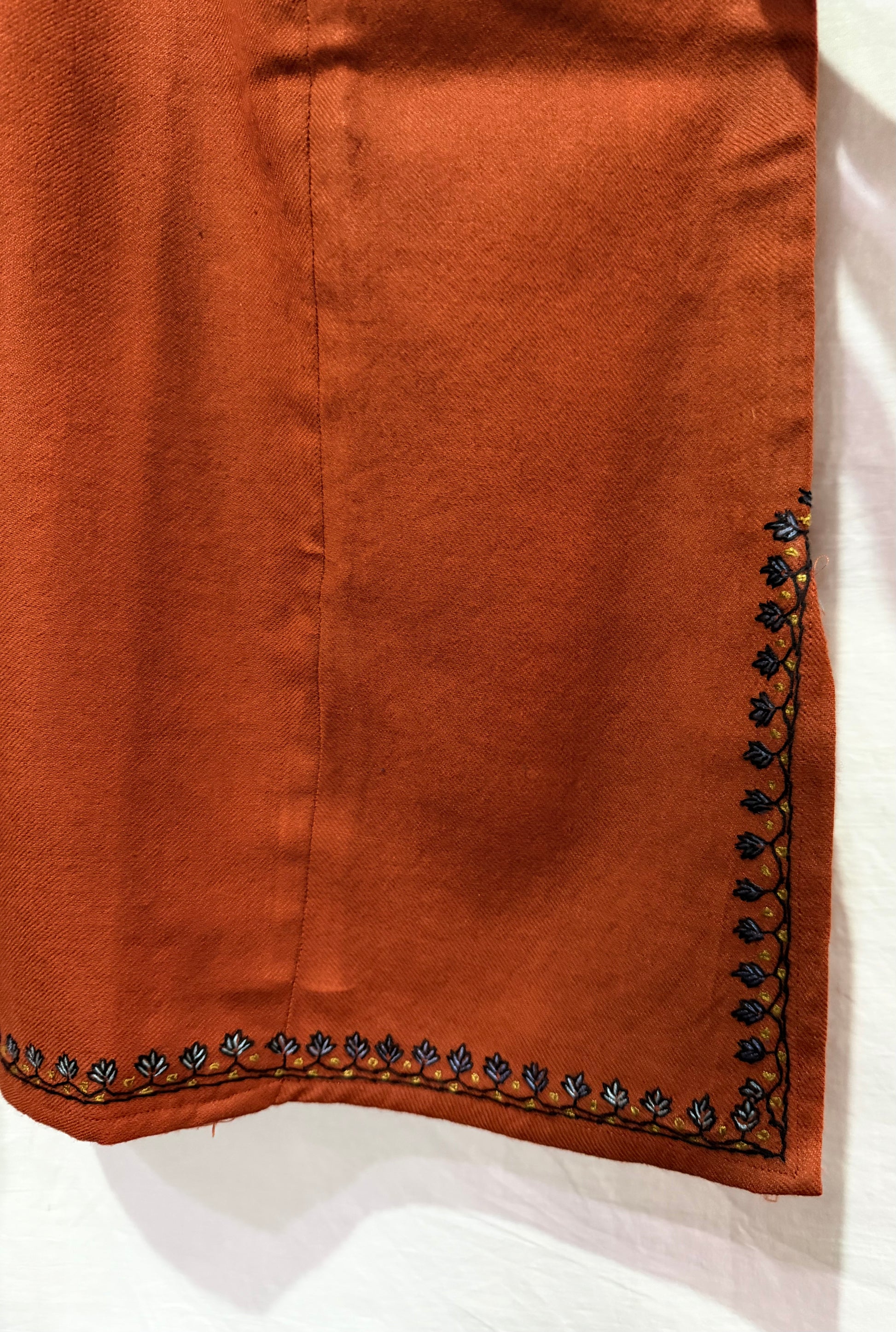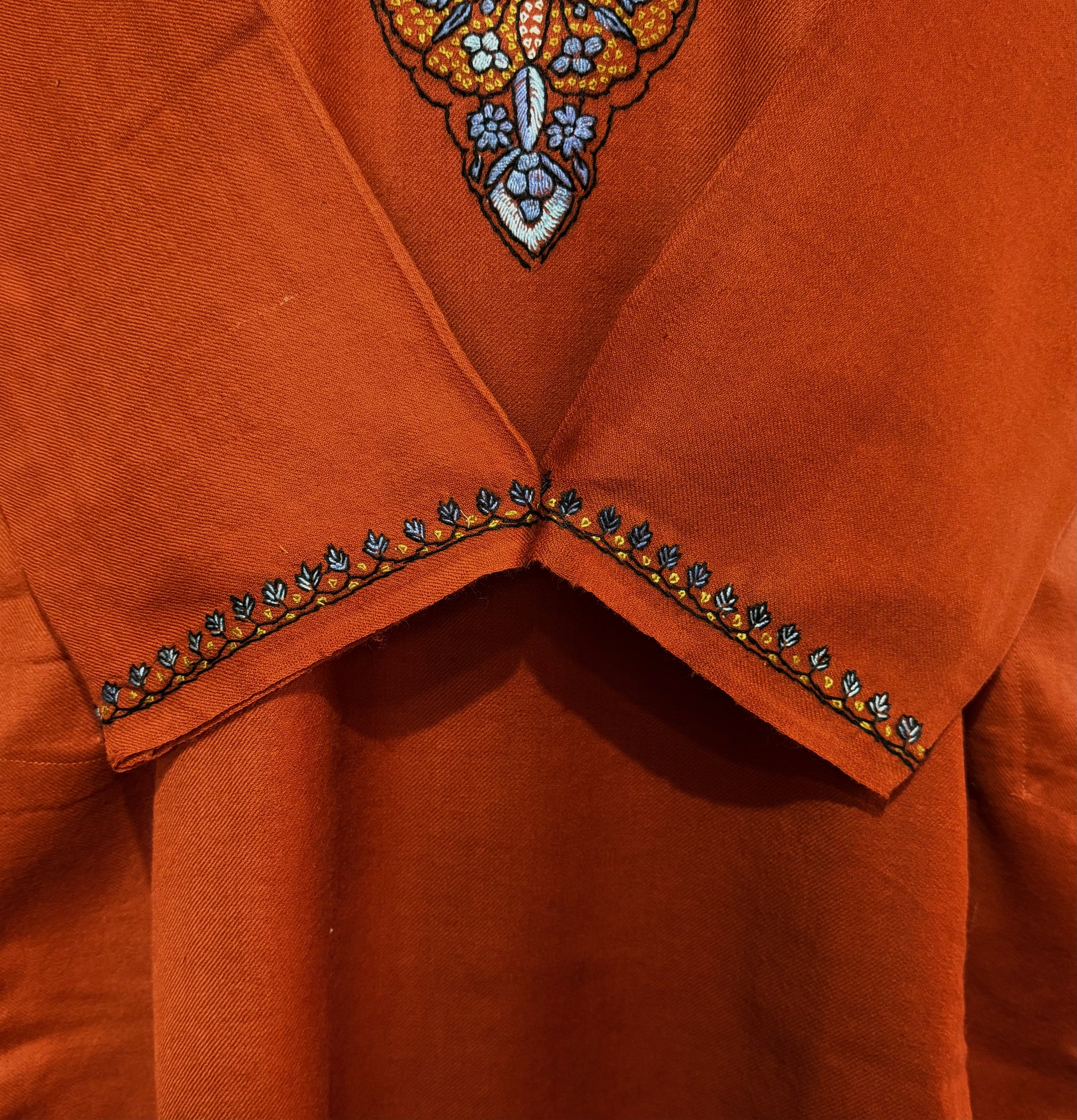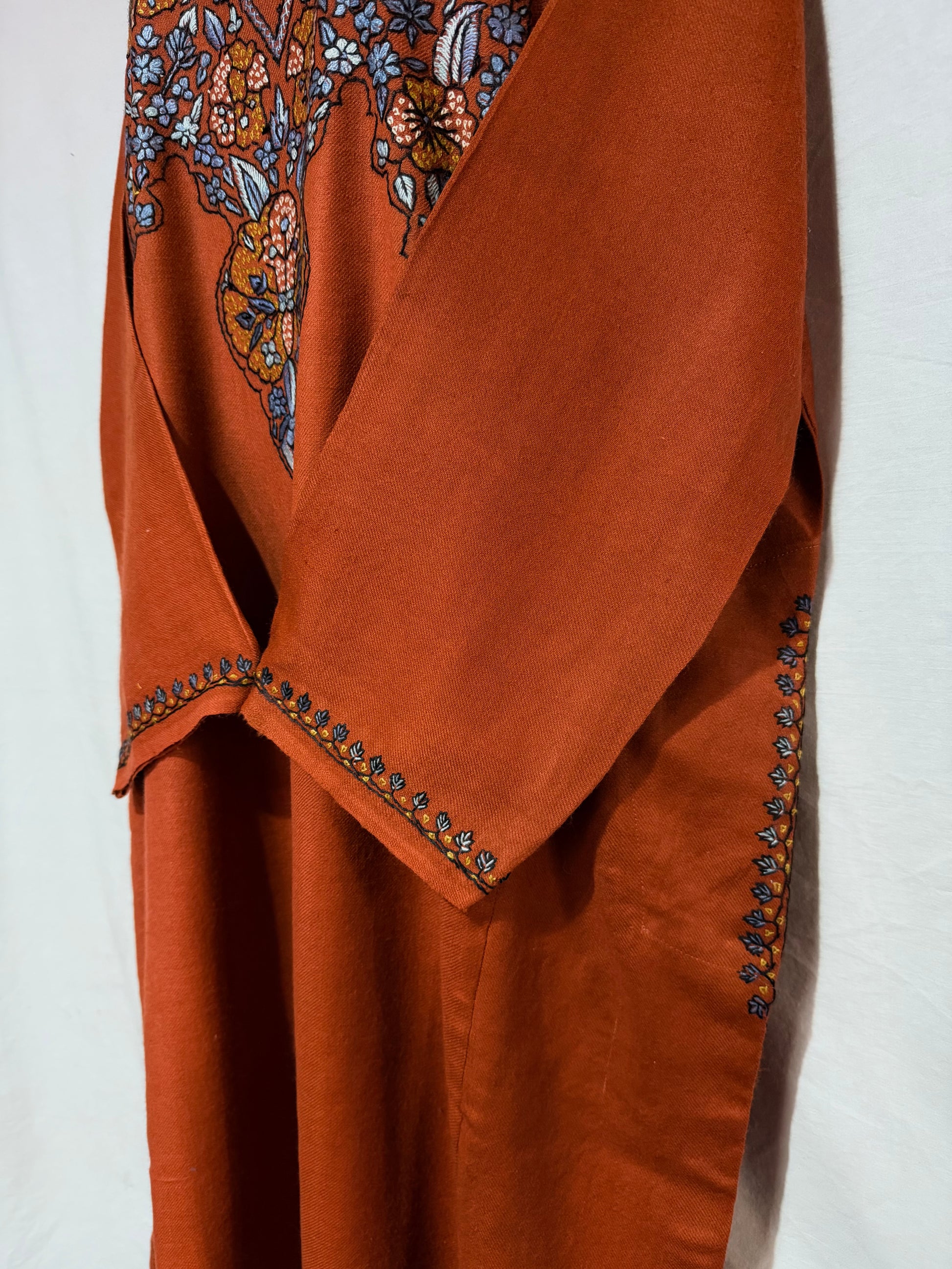 This exquisite pheran with hand sozni embroidery is a true masterpiece of traditional craftsmanship and timeless elegance. Carefully handcrafted by skilled artisans, the intricate embroidery adds depth, texture, and artistic beauty to the rich fabric.